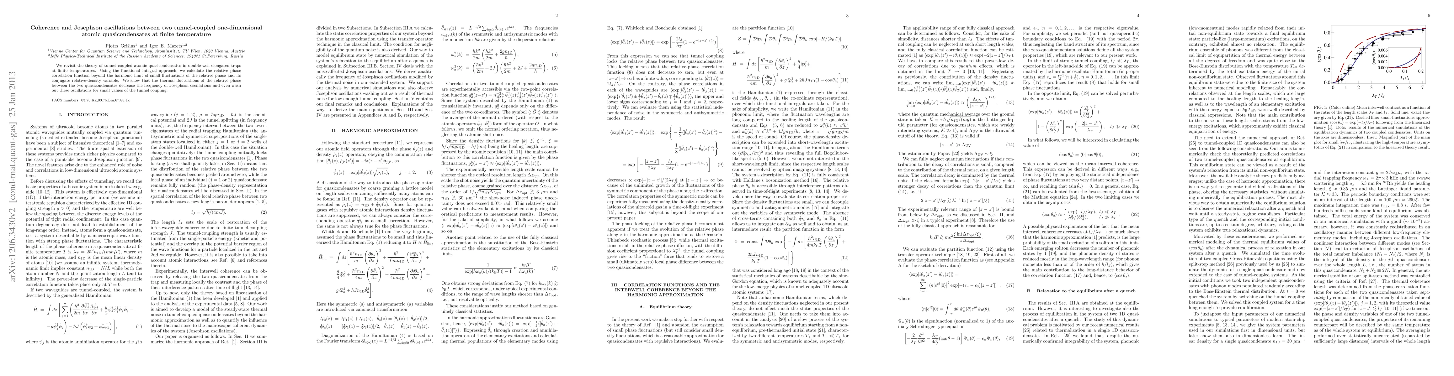 We revisit the theory of tunnel-coupled atomic quasicondensates in double-well elongated traps at finite temperatures. Using the functional-integral approach, we calculate the relative-phase correlation function beyond the harmonic limit of small fluctuations of the relative phase and its conjugate relative-density variable. We show that the thermal fluctuations of the relative phase between the two quasicondensates decrease the frequency of Josephson oscillations and even wash out these oscillations for small values of the tunnel coupling.
