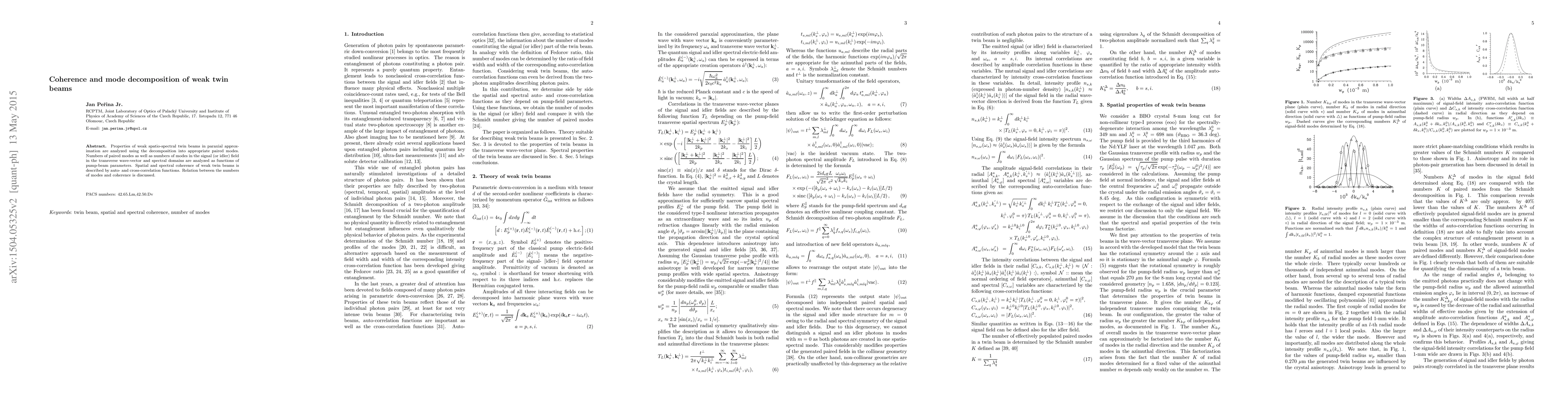 This paper analyzes the coherence and mode decomposition of weak twin beams in paraxial approximation, focusing on the paired modes and their dependence on pump-beam parameters. It examines the spatial and spectral coherence through auto- and cross-correlation functions, and discusses the relationship between mode numbers and coherence properties.