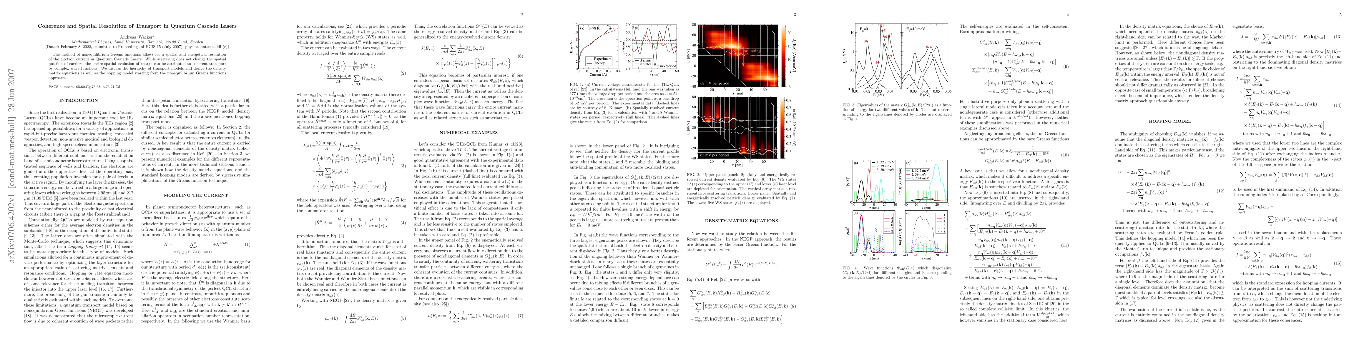 This paper utilizes nonequilibrium Greens functions to analyze the spatial and energetic resolution of electron current in Quantum Cascade Lasers, revealing that coherent transport is governed by complex wave functions, despite scattering effects. It also explores various transport models and derives density matrix equations and the hopping model from this approach.