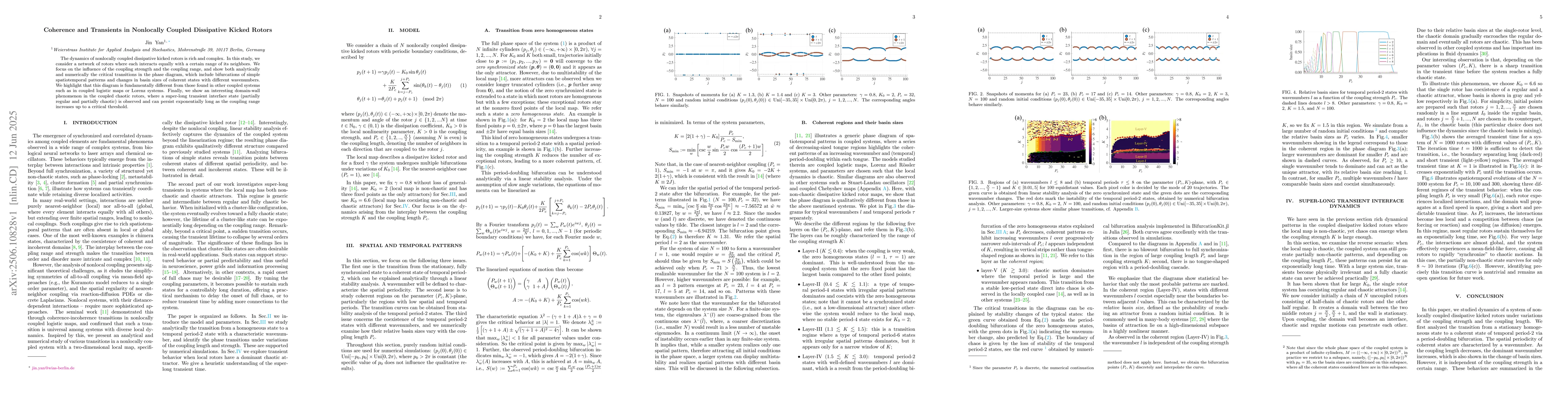 This study investigates the dynamics of nonlocally coupled dissipative kicked rotors, revealing critical transitions in phase diagrams that include bifurcations of patterns and changes in basin sizes of coherent states. The research also uncovers a super-long transient interface state that can persist exponentially long as the coupling range increases.