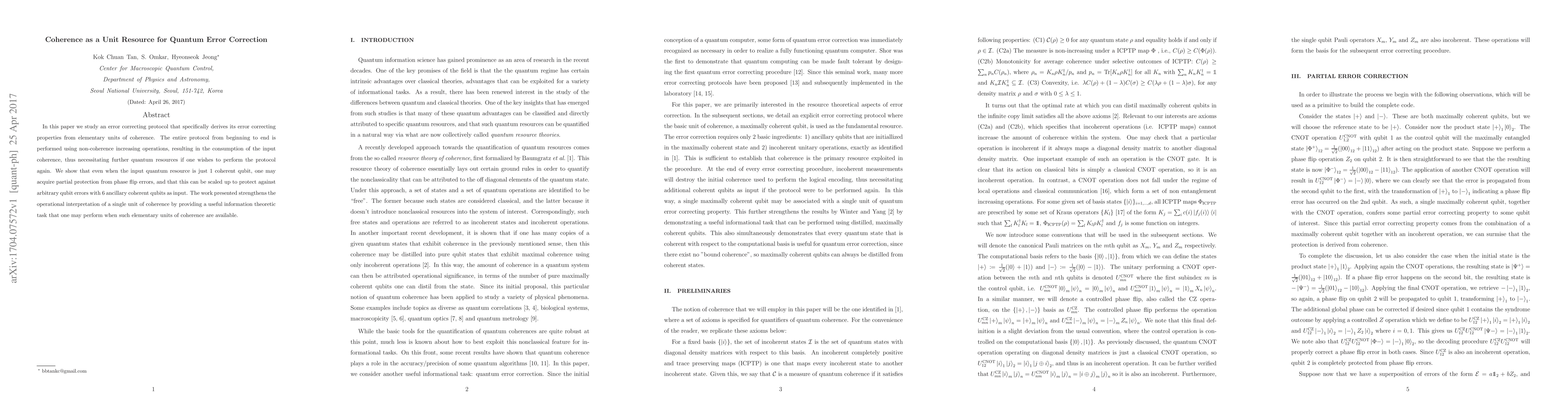 This paper proposes a quantum error correction protocol that leverages coherence as a fundamental resource, using non-coherence increasing operations to protect against errors. Even a single coherent qubit can provide partial protection against phase flip errors, which scales up to full qubit error protection with six additional coherent qubits.
