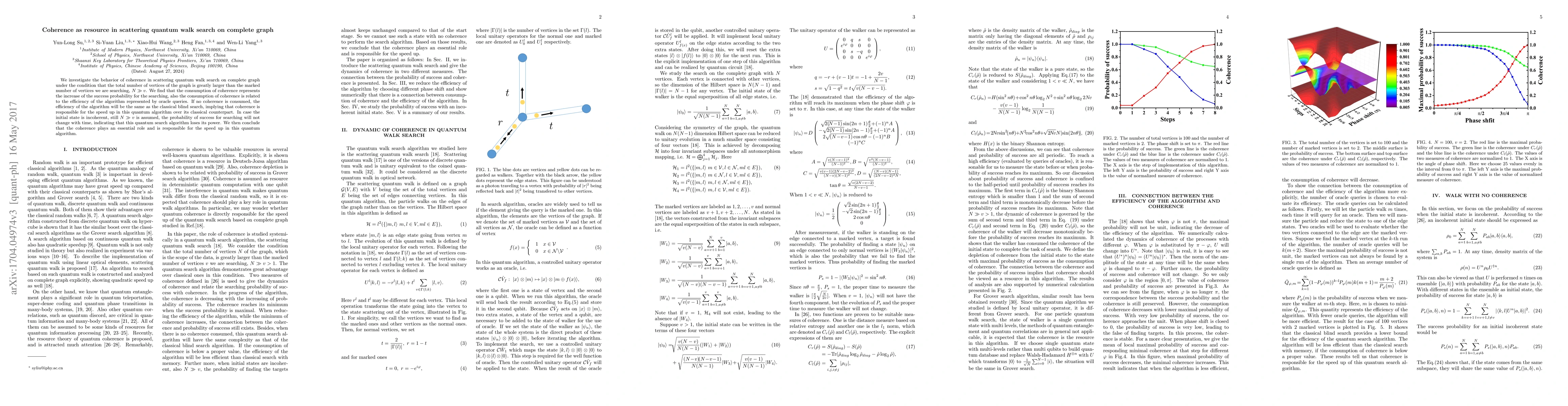 Quantum search algorithm benefits from coherence to speed up searching on complete graphs, but loses effectiveness if initial state is incoherent; coherence consumption directly impacts efficiency and success probability.