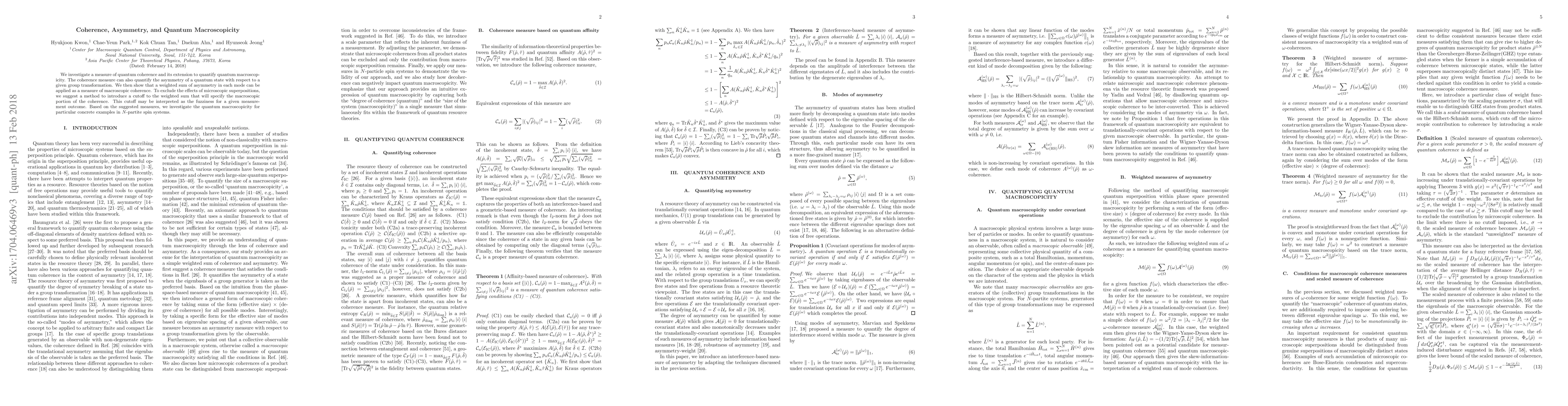 This paper proposes a measure of quantum coherence and extends it to quantify quantum macroscopicity, demonstrating its ability to quantify asymmetry in quantum states. It introduces a cutoff method to isolate macroscopic coherence, interpreting it as fuzziness in measurement outcomes, and applies these measures to N-partite spin systems.