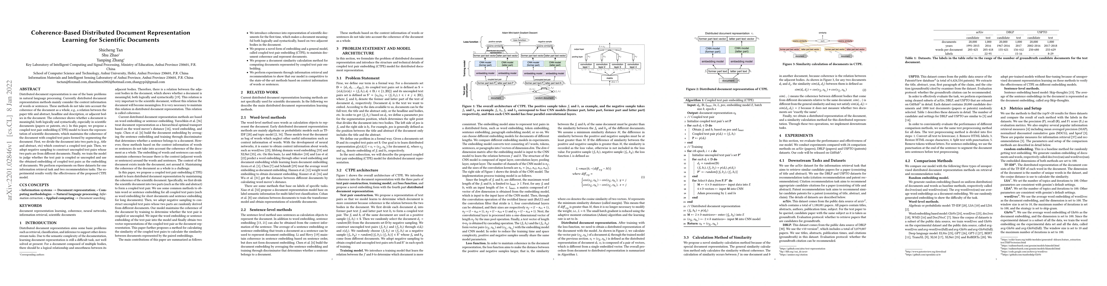 This paper introduces the Coupled Text Pair Embedding (CTPE) model for learning distributed representations of scientific documents, preserving document coherence by considering relationships between segments like titles and abstracts. Experiments on various tasks demonstrate the model's effectiveness in capturing meaningful document representations.