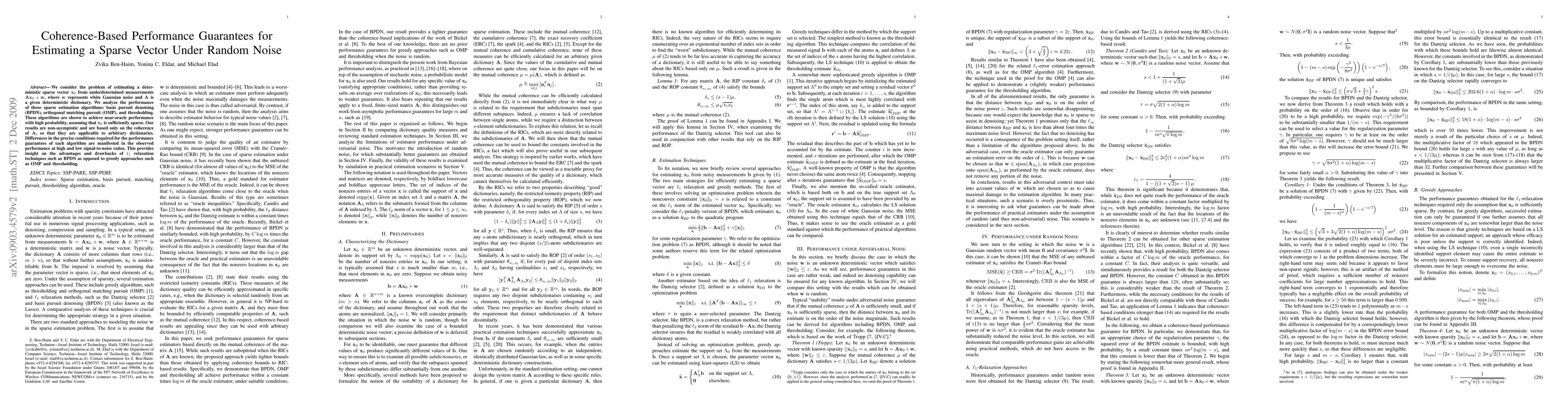 This paper investigates the performance of three sparse estimation algorithms—BPDN, OMP, and thresholding—under random noise, showing they achieve near-optimal results based on the coherence of the dictionary. The study highlights differences in their performance at varying signal-to-noise ratios, offering insights into the trade-offs between convex relaxation and greedy methods.