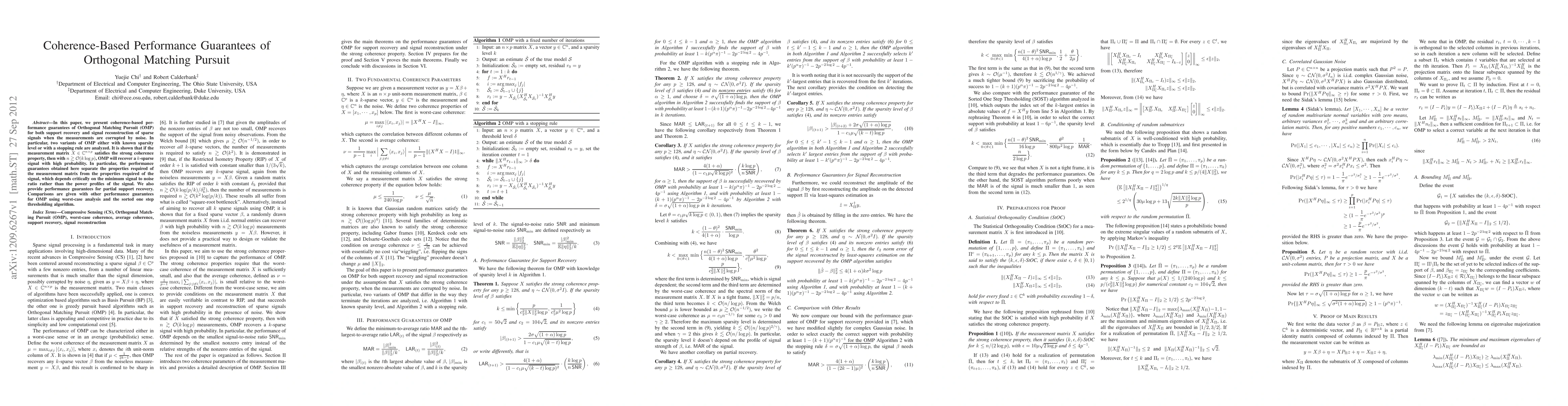 Researchers provide performance guarantees for Orthogonal Matching Pursuit (OMP) under corrupted measurements, showing that a strong coherence property in the measurement matrix allows OMP to recover sparse signals with high probability. The findings separate signal properties from measurement properties, highlighting the importance of minimum signal-to-noise ratio.
