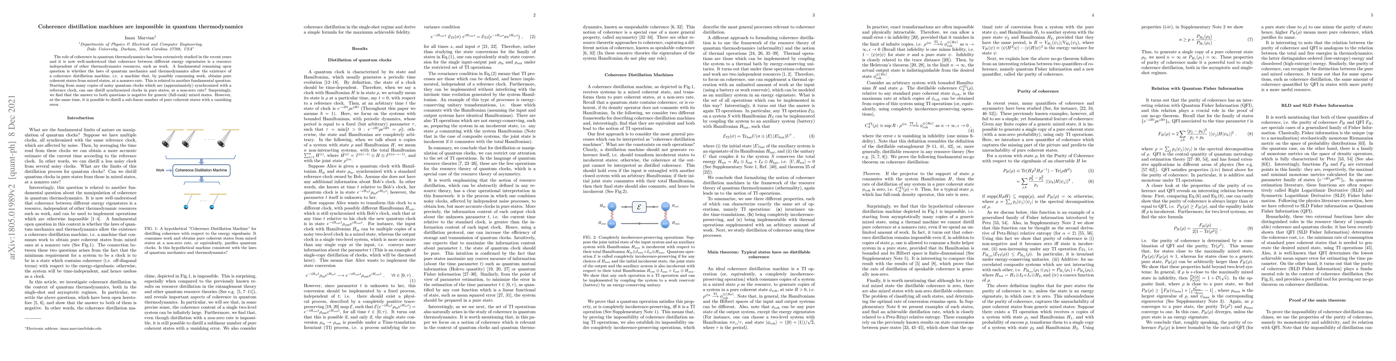 The role of coherence in quantum thermodynamics has been extensively studied in the recent years and it is now well-understood that coherence between different energy eigenstates is a resource independent of other thermodynamics resources, such as work. A fundamental remaining open question is whether the laws of quantum mechanics and thermodynamics allow the existence of a coherence distillation machine, i.e., a machine that, by possibly consuming work, obtains pure coherent states from mixed states, at a nonzero rate. This is related to another fundamental question: Starting from many copies of noisy quantum clocks which are (approximately) synchronized with a reference clock, can one distill synchronized clocks in pure states, at a non-zero rate? Surprisingly, we find that the answer to both questions is negative for generic (full-rank) mixed states. However, at the same time, it is possible to distill a sub-linear number of pure coherent states with a vanishing error.
