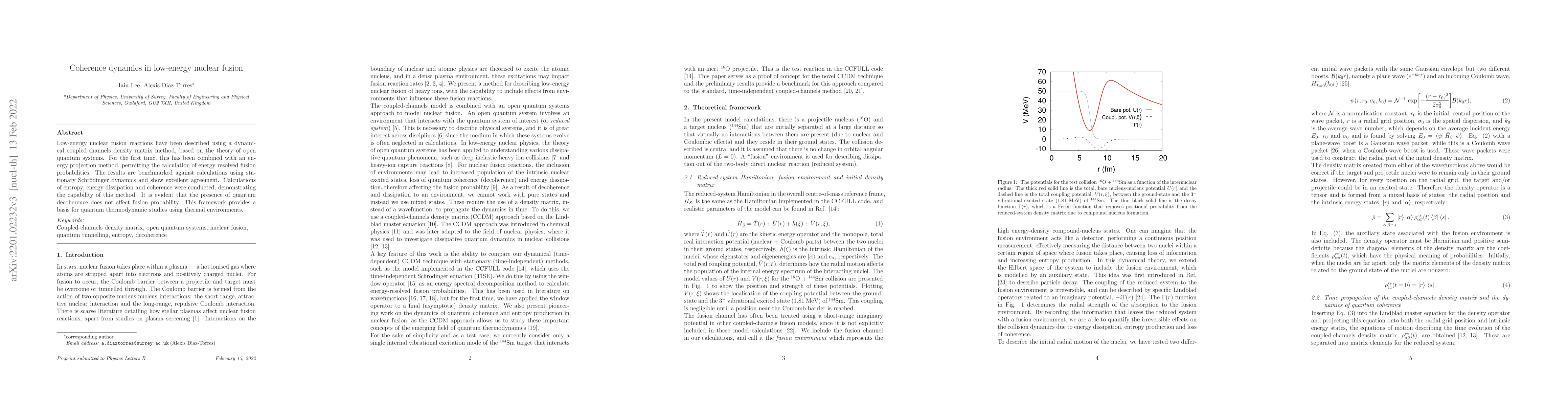 The novelty of this work lies in combining the dynamical coupled-channels density matrix method with an energy projection technique, providing a comprehensive framework for studying low-energy nuclear fusion reactions, including quantum coherence dynamics and environmental effects.