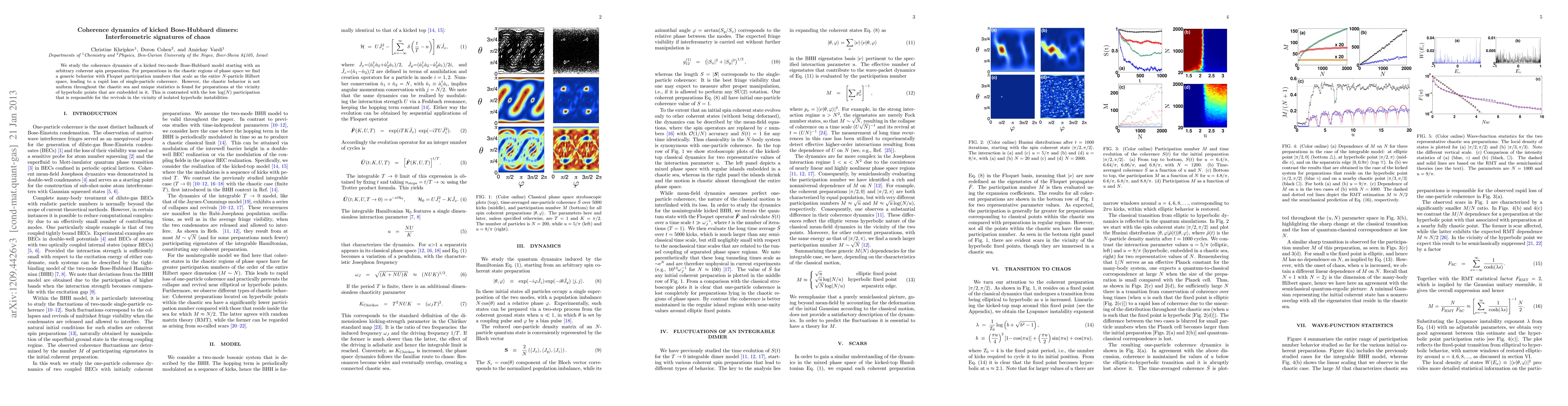 We study the coherence dynamics of a kicked two-mode Bose-Hubbard model starting with an arbitrary coherent spin preparation. For preparations in the chaotic regions of phase-space we find a generic behavior with Flouquet participation numbers that scale as the entire $N$-particle Hilbert space, leading to a rapid loss of single particle coherence. However, the chaotic behavior is not uniform throughout the chaotic sea, and unique statistics is found for preparations at the vicinity of hyperbolic points that are embedded in it. This is contrasted with the low log(N) participation that is responsible for the revivals at the vicinity of isolated hyperbolic instabilities.