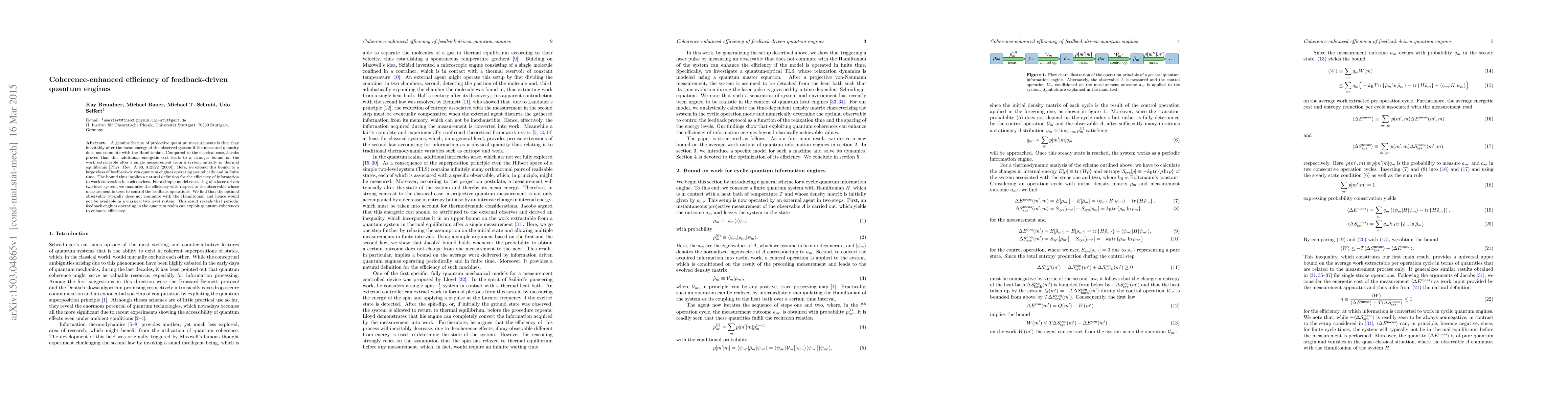 This paper extends Jacobs' bound on work extractable from quantum systems to feedback-driven quantum engines, revealing that coherence-enhanced measurements can improve efficiency beyond classical limits. The optimal measurement for maximizing efficiency in a laser-driven two-level system often involves non-commuting observables, showcasing quantum coherence's role in enhancing engine efficiency.
