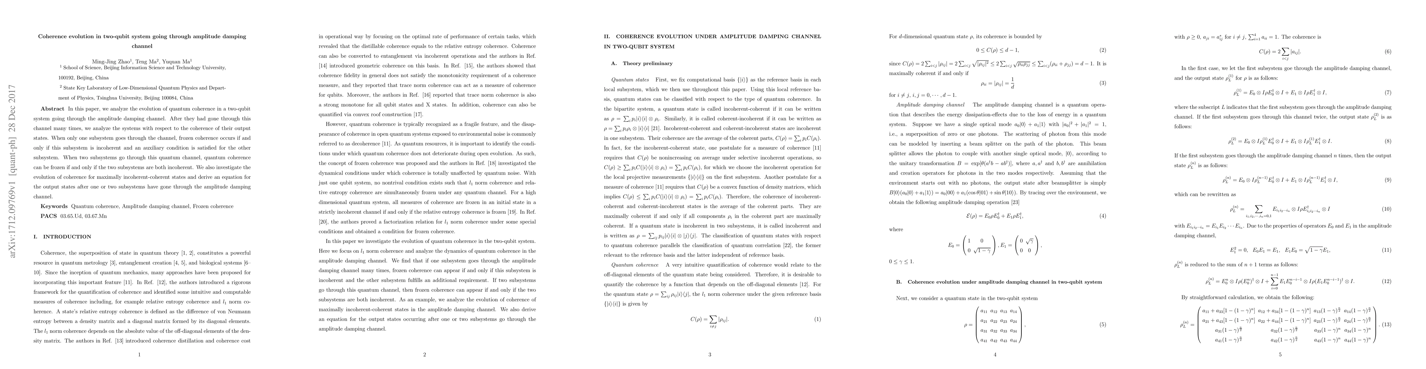 In this paper, we analyze the evolution of quantum coherence in a two-qubit system going through the amplitude damping channel. After they have gone through this channel many times, we analyze the systems with respect to the coherence of their output states. When only one subsystem goes through the channel, frozen coherence occurs if and only if this subsystem is incoherent and an auxiliary condition is satisfied for the other subsystem. When two subsystems go through this quantum channel, quantum coherence can be frozen if and only if the two subsystems are both incoherent. We also investigate the evolution of coherence for maximally incoherent-coherent states and derive an equation for the output states after one or two subsystems have gone through the amplitude damping channel.