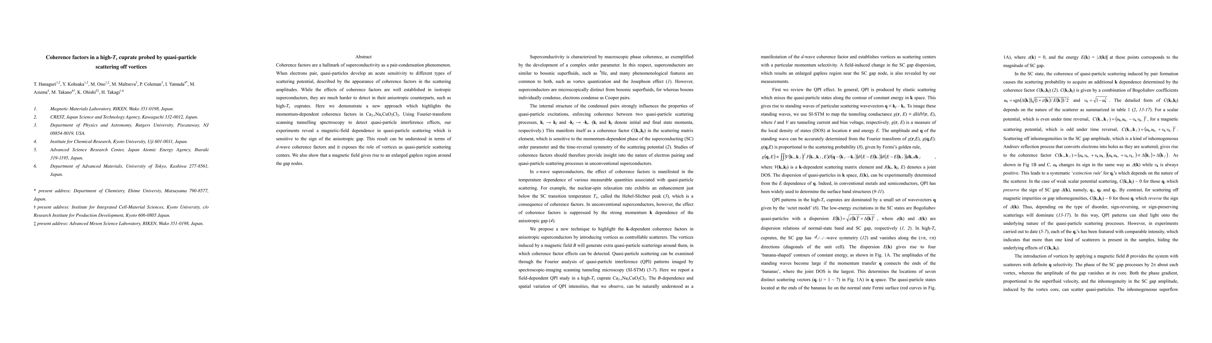 This study investigates the coherence factors in high-Tc cuprate superconductors using quasi-particle scattering off vortices, revealing a magnetic-field dependent scattering sensitive to the anisotropic gap, indicative of d-wave pairing and highlighting the role of vortices in scattering.