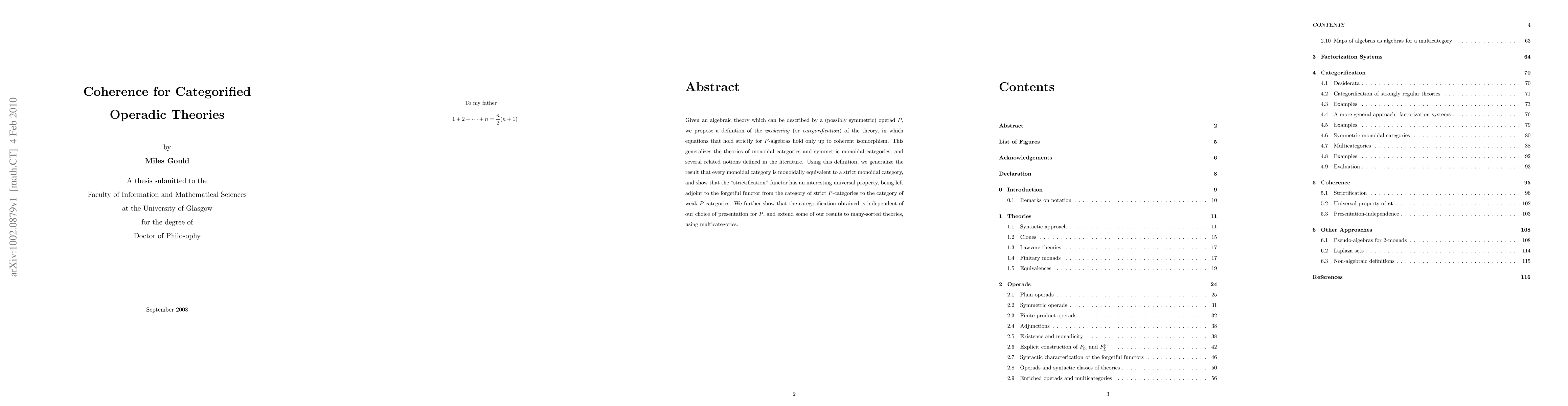 Given an algebraic theory which can be described by a (possibly symmetric) operad $P$, we propose a definition of the \emph{weakening} (or \emph{categorification}) of the theory, in which equations that hold strictly for $P$-algebras hold only up to coherent isomorphism. This generalizes the theories of monoidal categories and symmetric monoidal categories, and several related notions defined in the literature. Using this definition, we generalize the result that every monoidal category is monoidally equivalent to a strict monoidal category, and show that the "strictification" functor has an interesting universal property, being left adjoint to the forgetful functor from the category of strict $P$-categories to the category of weak $P$-categories. We further show that the categorification obtained is independent of our choice of presentation for $P$, and extend some of our results to many-sorted theories, using multicategories.