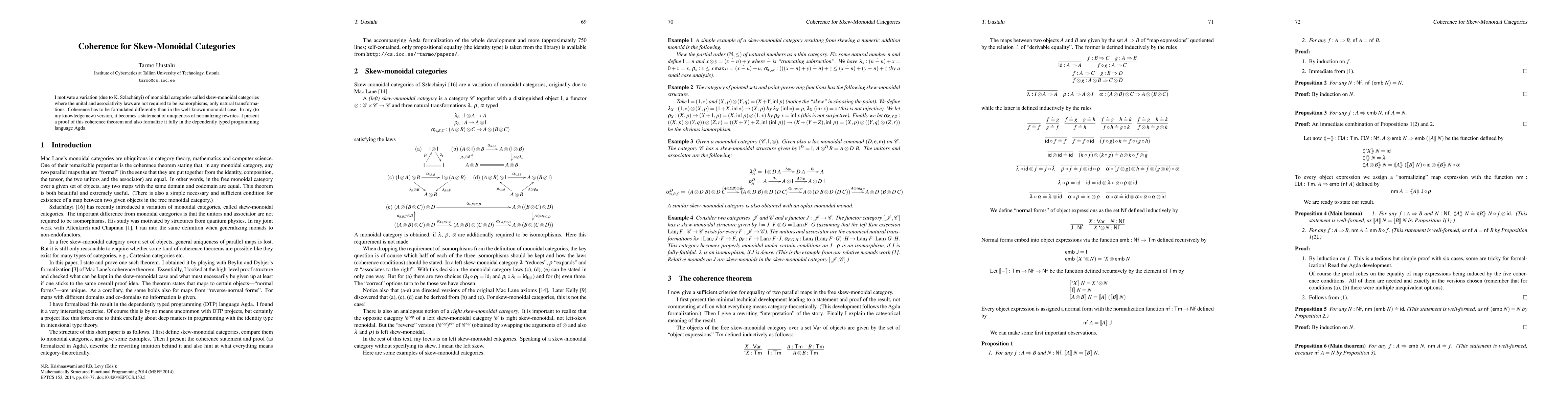 This paper introduces skew-monoidal categories, a variant of monoidal categories with relaxed unital and associativity laws, and proposes a new coherence theorem based on the uniqueness of normalizing rewrites. The author provides a formal proof and implements this coherence in the Agda programming language.