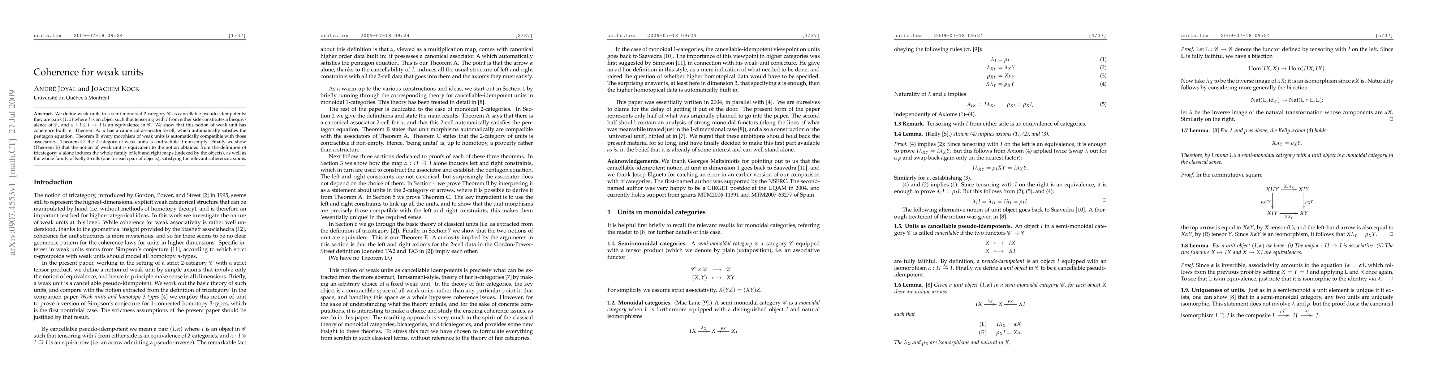 We define weak units in a semi-monoidal 2-category $\CC$ as cancellable pseudo-idempotents: they are pairs $(I,\alpha)$ where $I$ is an object such that tensoring with $I$ from either side constitutes a biequivalence of $\CC$, and $\alpha: I \tensor I \to I$ is an equivalence in $\CC$. We show that this notion of weak unit has coherence built in: Theorem A: $\alpha$ has a canonical associator 2-cell, which automatically satisfies the pentagon equation. Theorem B: every morphism of weak units is automatically compatible with those associators. Theorem C: the 2-category of weak units is contractible if non-empty. Finally we show (Theorem E) that the notion of weak unit is equivalent to the notion obtained from the definition of tricategory: $\alpha$ alone induces the whole family of left and right maps (indexed by the objects), as well as the whole family of Kelly 2-cells (one for each pair of objects), satisfying the relevant coherence axioms.