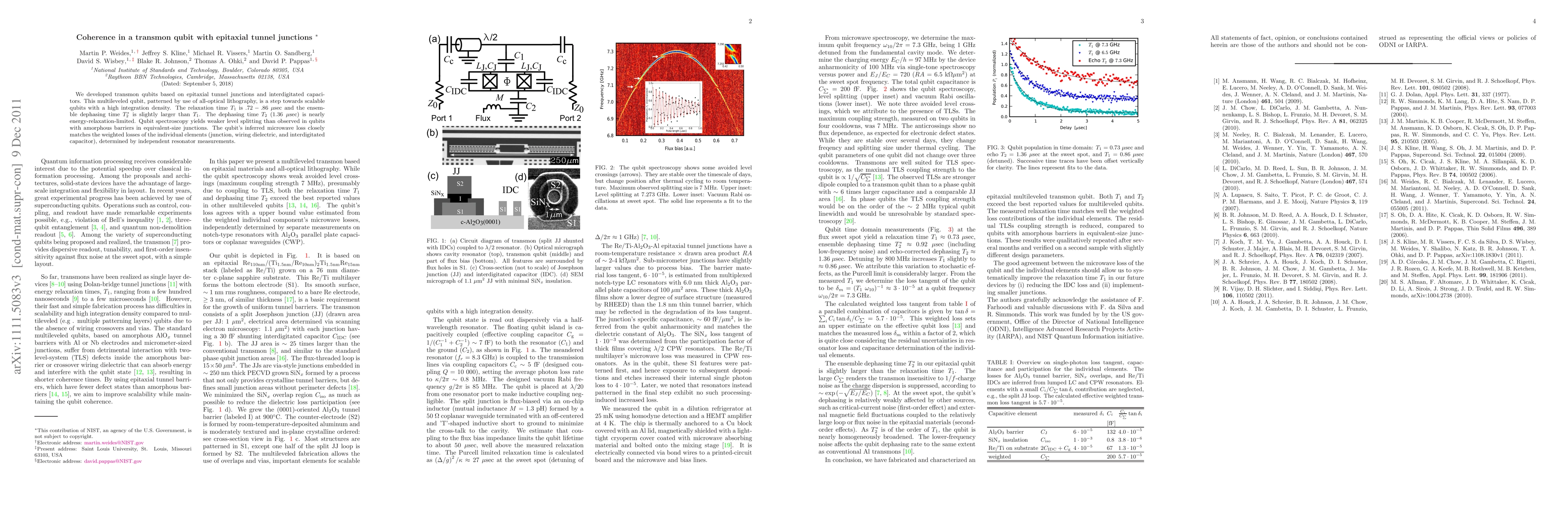 This paper reports on the development of transmon qubits using epitaxial tunnel junctions and interdigitated capacitors, achieving high integration density. The qubits show relaxation time T1 between .72-.86µsec and dephasing time T2 of 1.36µsec, nearly limited by energy relaxation, with weaker level splitting compared to amorphous barrier qubits.