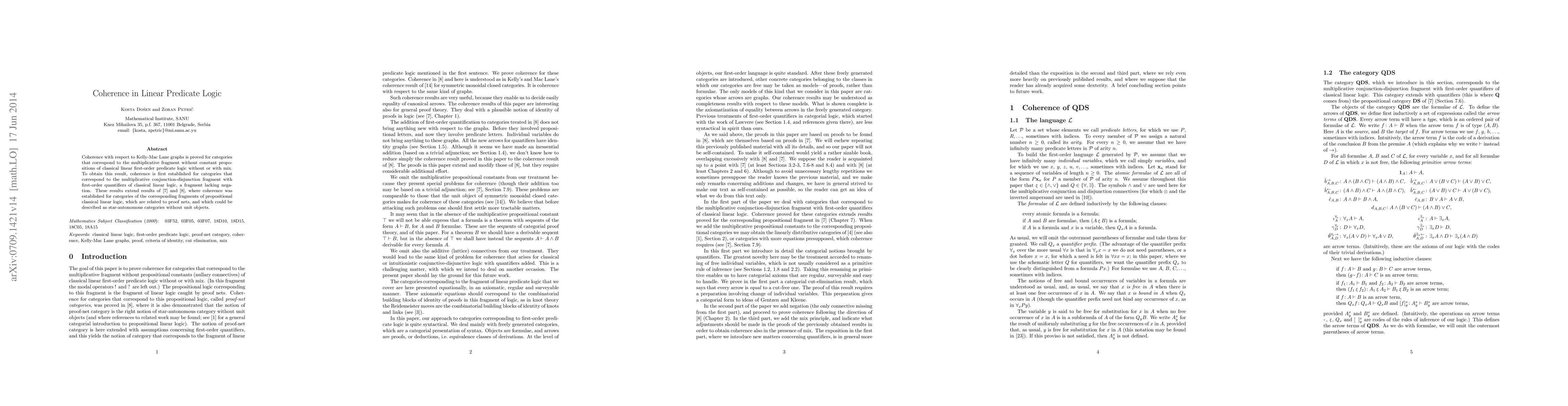 Researchers prove coherence in linear predicate logic categories that correspond to specific fragments of classical linear logic, extending previous results on propositional logic.