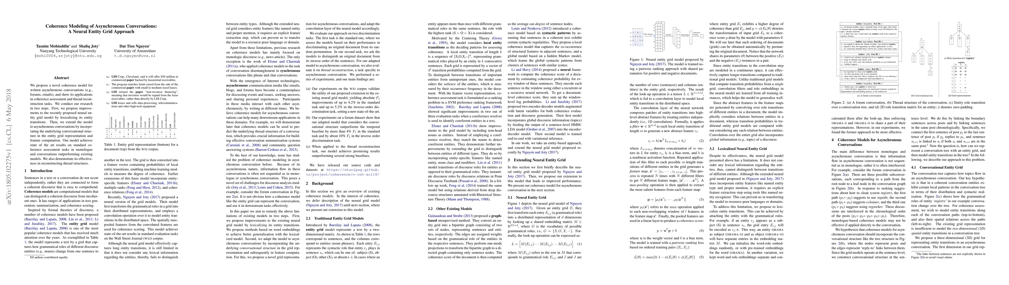 This paper introduces a novel coherence model for asynchronous conversations using a neural entity grid, enhancing it with lexicalized entity transitions and incorporating conversational structure. The model achieves top performance in coherence assessment and thread reconstruction tasks.