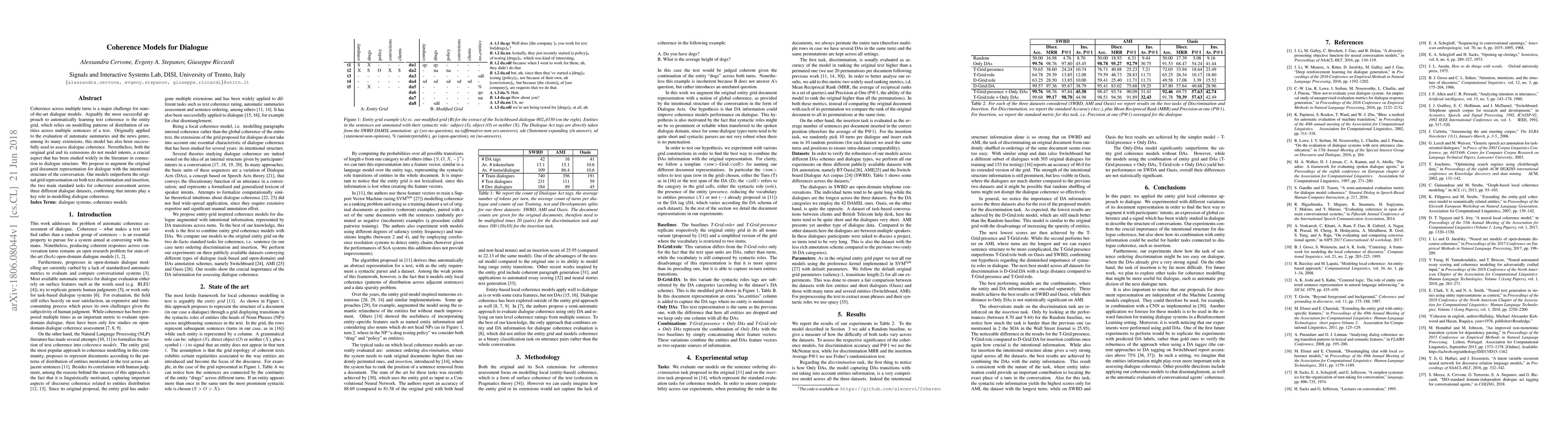 This paper proposes augmenting the entity grid model for dialogue coherence with an intentional structure, which captures conversational intents. The enhanced model outperforms the original grid in standard coherence assessment tasks across multiple datasets, demonstrating the importance of intents in dialogue coherence.