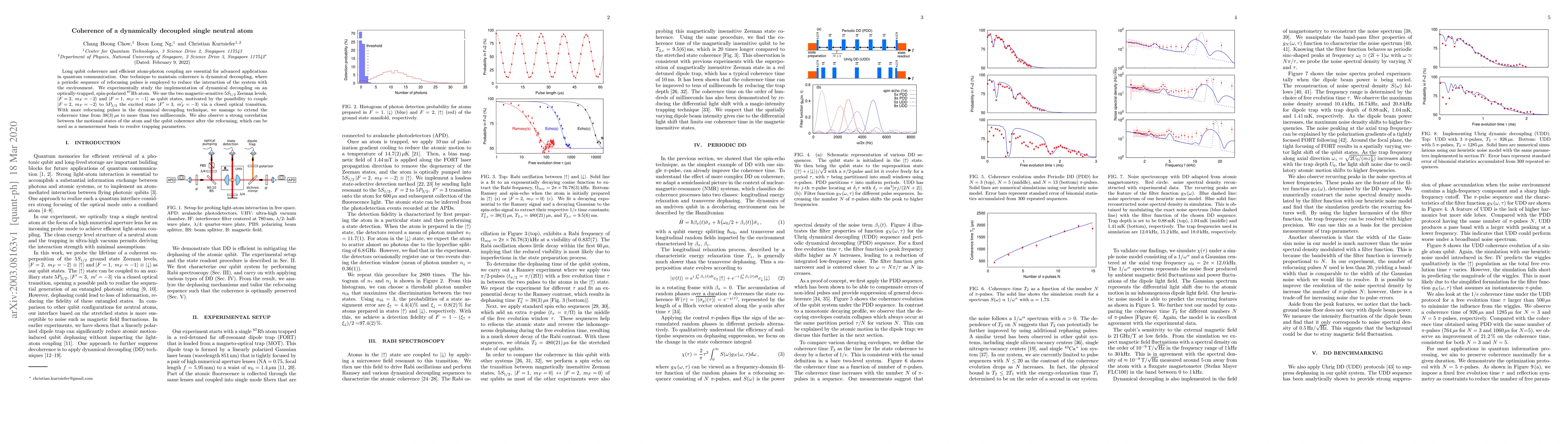 This research investigates the use of dynamical decoupling to enhance the coherence time of a single neutral atom qubit in a $^{87}$Rb atom, achieving a coherence time of over two milliseconds. The study also finds a significant correlation between the atom's motional states and qubit coherence, which can help determine trapping parameters.