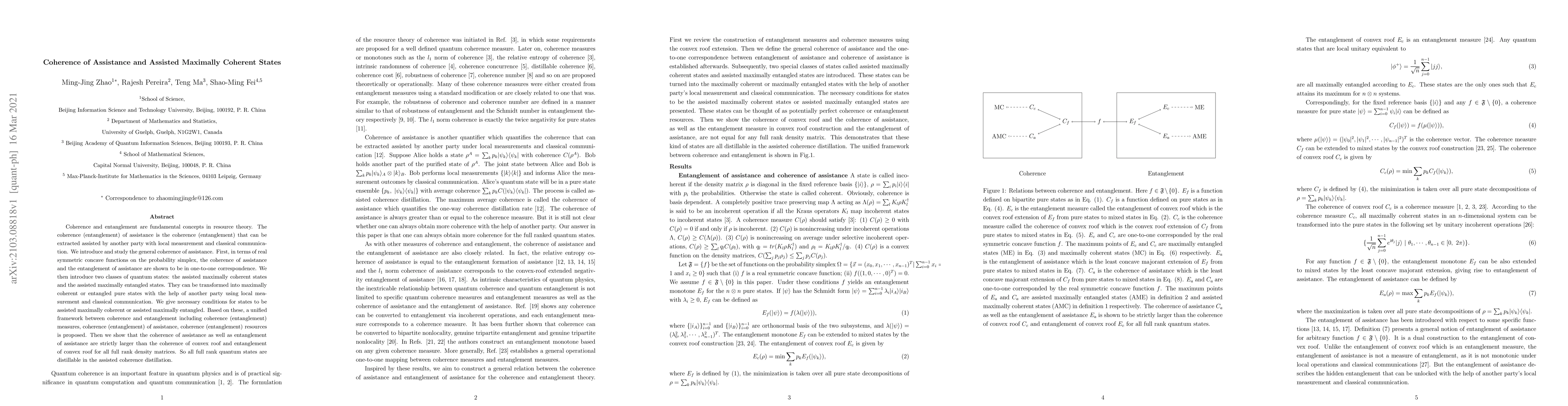 The paper introduces the concept of coherence of assistance, establishes its correspondence with entanglement of assistance, and proposes assisted maximally coherent and entangled states as quantum resources.