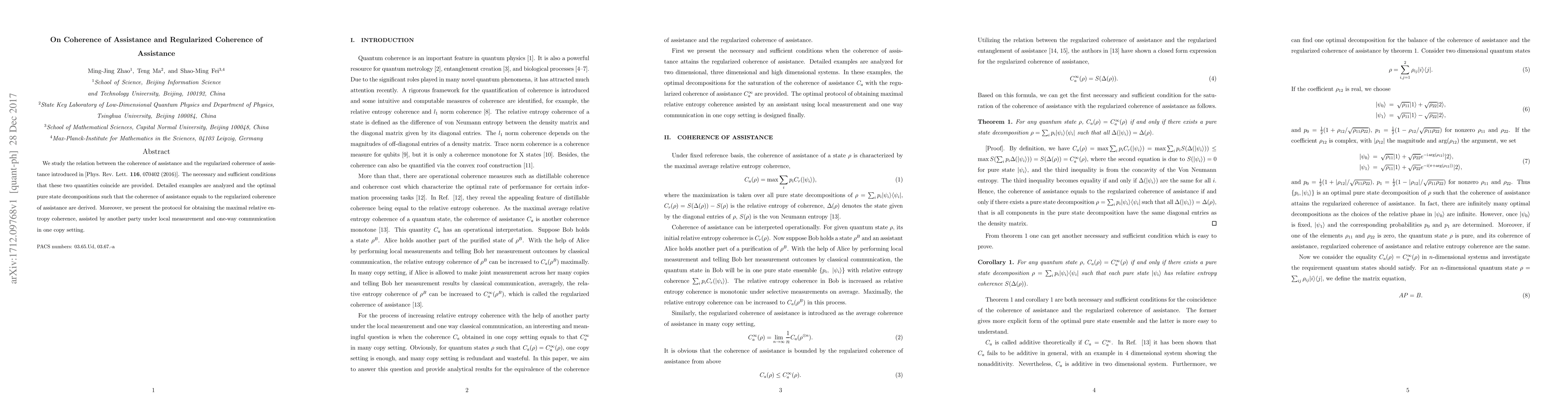 This paper investigates the relationship between coherence of assistance and its regularized version, providing conditions for their equivalence. It also derives optimal pure state decompositions where these two quantities match and outlines a protocol for achieving maximal relative entropy coherence through local measurement and communication.
