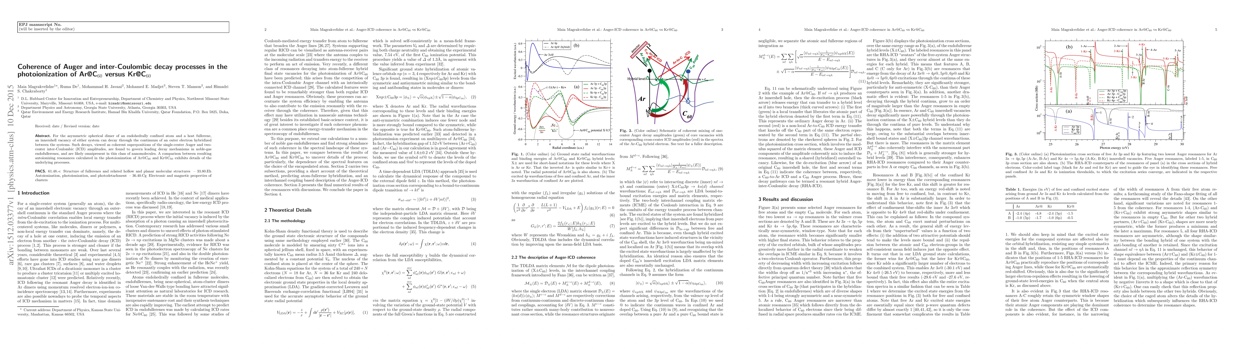 For the asymmetric spherical dimer of an endohedrally confined atom and a host fullerene, an innershell vacancy of either system can decay through the continuum of an outer electron hybridized between the systems. Such decays, viewed as coherent superpositions of the single-center Auger and two-center inter-Coulombic (ICD) amplitudes, are found to govern leading decay mechanisms in noble-gas endofullerenes, and are likely omnipresent in this class of nanomolecules. A comparison between resulting autoionizing resonances calculated in the photoionization of Ar@C60 and Kr@C60 exhibits details of the underlying processes.