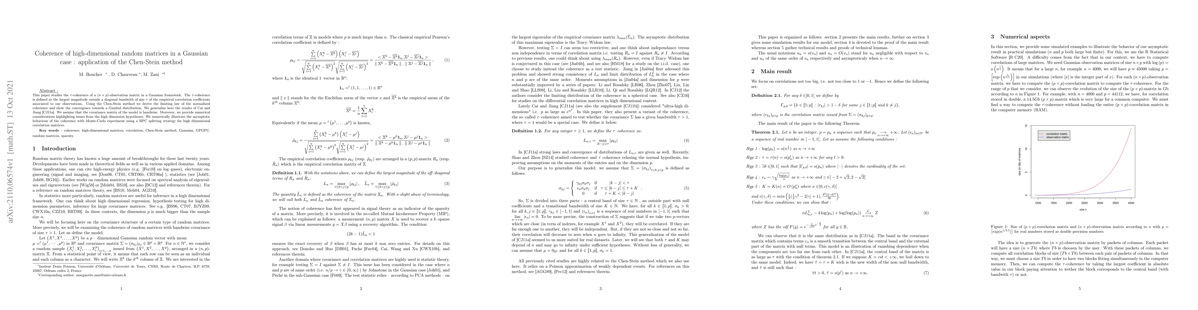This paper investigates the $\tau$-coherence of high-dimensional Gaussian random matrices, applying the Chen-Stein method to derive the limiting law of normalized coherence, showing convergence to a Gumbel distribution. Numerical experiments using Monte-Carlo simulations and high-performance computing strategies illustrate the asymptotic behavior under high-dimensional conditions.