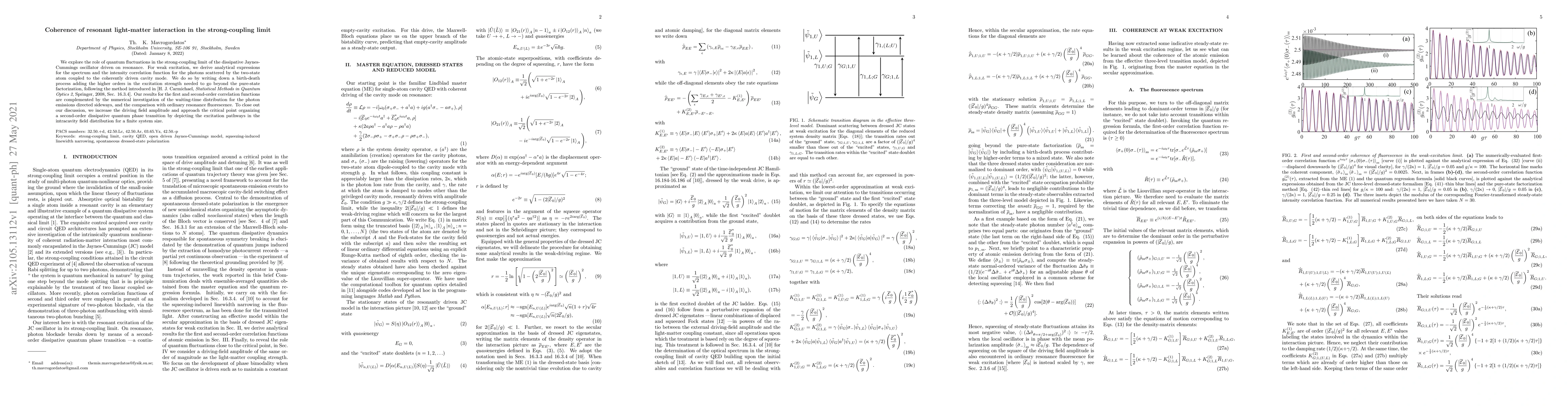 We explore the role of quantum fluctuations in the strong-coupling limit of the dissipative Jaynes-Cummings oscillator driven on resonance. For weak excitation, we derive analytical expressions for the spectrum and the intensity correlation function for the photons scattered by the two-state atom coupled to the coherently driven cavity mode. We do so by writing down a birth-death process adding the higher orders in the excitation strength needed to go beyond the pure-state factorization, following the method introduced in [H. J. Carmichael, {\it Statistical Methods in Quantum Optics 2}, Springer, 2008, Sec. 16.3.4]. Our results for the first and second-order correlation functions are complemented by the numerical investigation of the waiting-time distribution for the photon emissions directed sideways, and the comparison with ordinary resonance fluorescence. To close out our discussion, we increase the driving field amplitude and approach the critical point organizing a second-order dissipative quantum phase transition by depicting the excitation pathways in the intracavity field distribution for a finite system size.