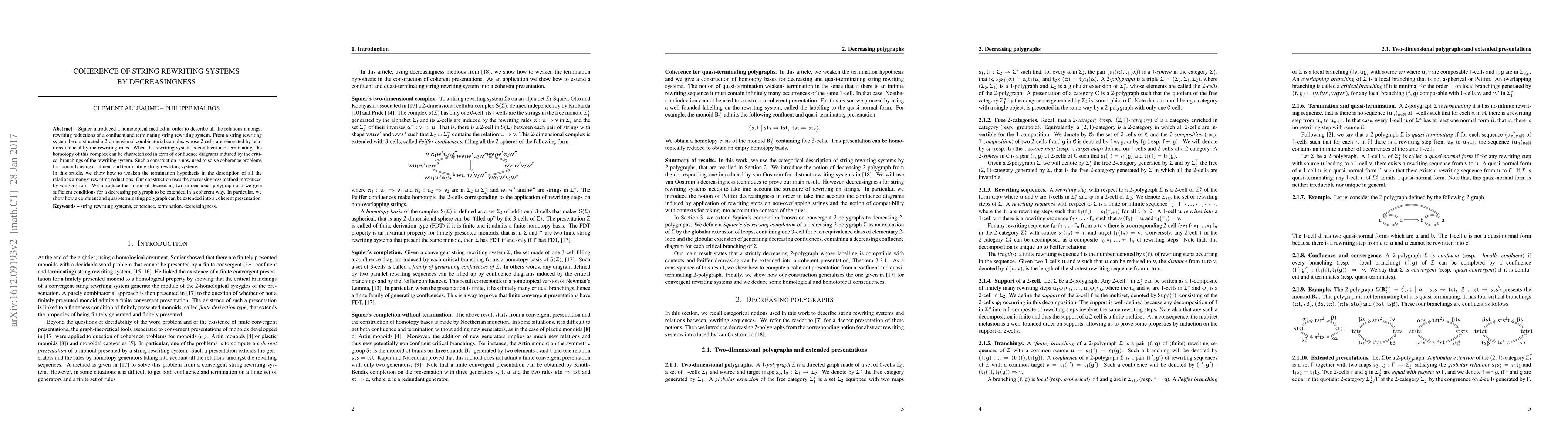Squier introduced a homotopical method in order to describe all the relations amongst rewriting reductions of a confluent and terminating string rewriting system. From a string rewriting system he constructed a $2$-dimensional combinatorial complex whose $2$-cells are generated by relations induced by the rewriting rules. When the rewriting system is confluent and terminating, the homotopy of this complex can be characterized in term of confluence diagrams induced by the critical branchings of the rewriting system. Such a construction is now used to solve coherence problems for monoids using string rewriting systems. In this article, we show how to weaken the termination hypothesis in the description of all the relations amongst rewriting reductions. Our construction uses the decreasingness method introduced by van Oostrom. We introduce the notion of decreasing two-dimensional polygraph and we give sufficient conditions for a decreasing polygraph to be extended in a coherent way. In particular, we show how a confluent and quasi-terminating polygraph can be extended into a coherent presentation.