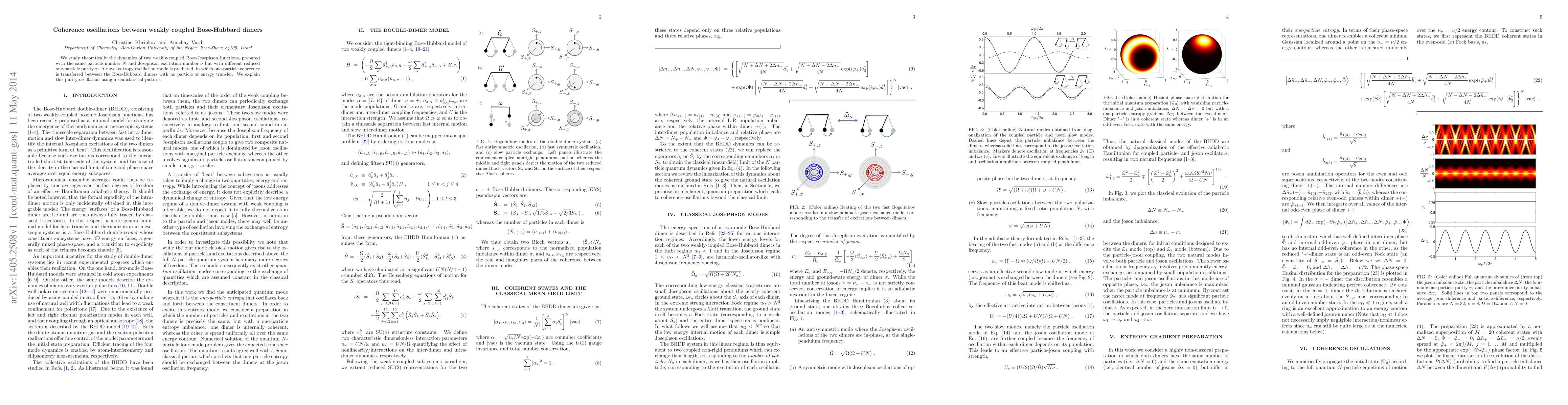 This paper theoretically investigates the dynamics of two weakly-coupled Bose-Hubbard dimers, predicting a novel entropy oscillation mode where coherence is transferred between them without particle or energy exchange. The phenomenon is explained through a semiclassical model.