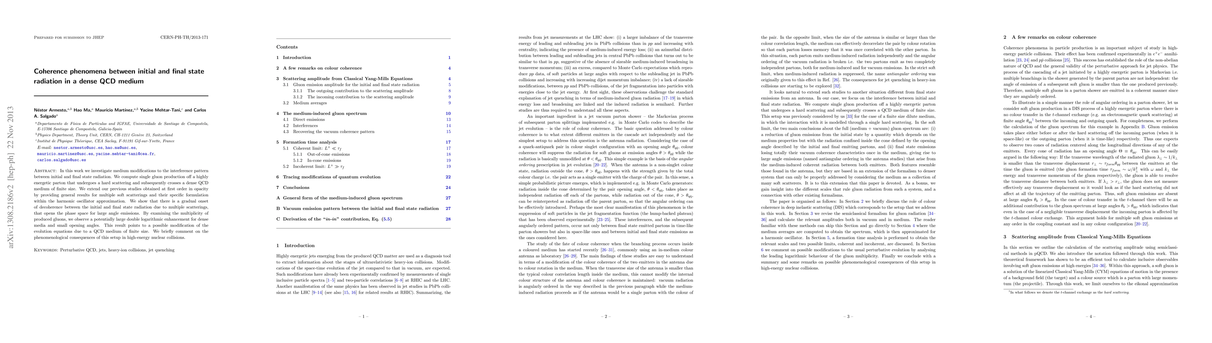In this work we investigate medium modifications to the interference pattern between initial and final state radiation. We compute single gluon production off a highly energetic parton that undergoes a hard scattering and subsequently crosses a dense QCD medium of finite size. We extend our previous studies obtained at first order in opacity by providing general results for multiple soft scatterings and their specific formulation within the harmonic oscillator approximation. We show that there is a gradual onset of decoherence between the initial and final state radiation due to multiple scatterings, that opens the phase space for large angle emissions. By examining the multiplicity of produced gluons, we observe a potentially large double logarithmic enhancement for dense media and small opening angles. This result points to a possible modification of the evolution equations due to a QCD medium of finite size. We briefly comment on the phenomenological consequences of this setup in high-energy nuclear collisions.