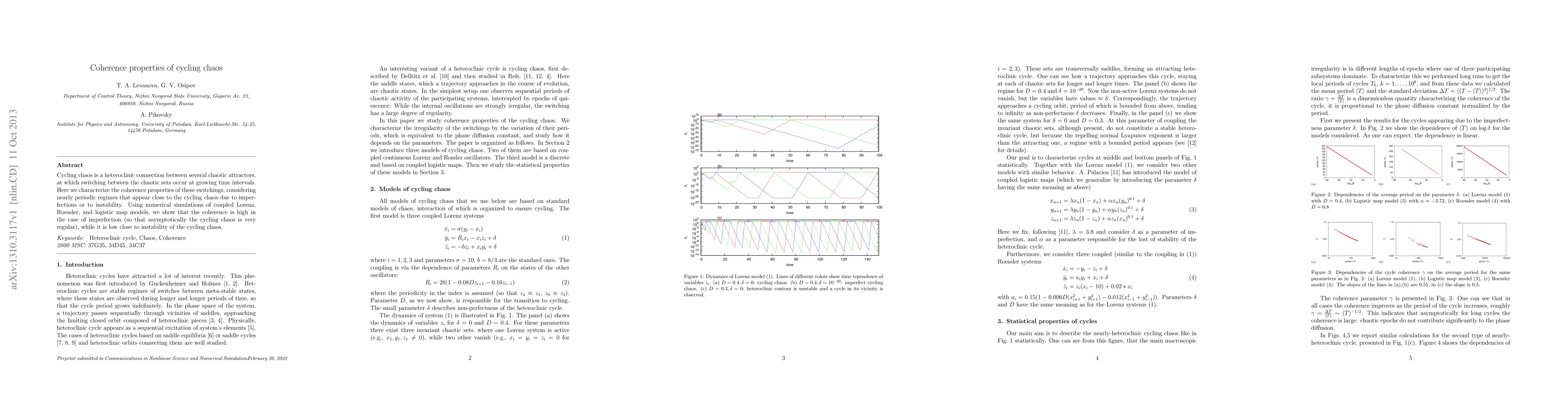 Cycling chaos is a heteroclinic connection between several chaotic attractors, at which switching between the chaotic sets occur at growing time intervals. Here we characterize the coherence properties of these switchings, considering nearly periodic regimes that appear close to the cycling chaos due to imperfections or to instability. Using numerical simulations of coupled Lorenz, Roessler, and logistic map models, we show that the coherence is high in the case of imperfection (so that asymptotically the cycling chaos is very regular), while it is low close to instability of the cycling chaos.