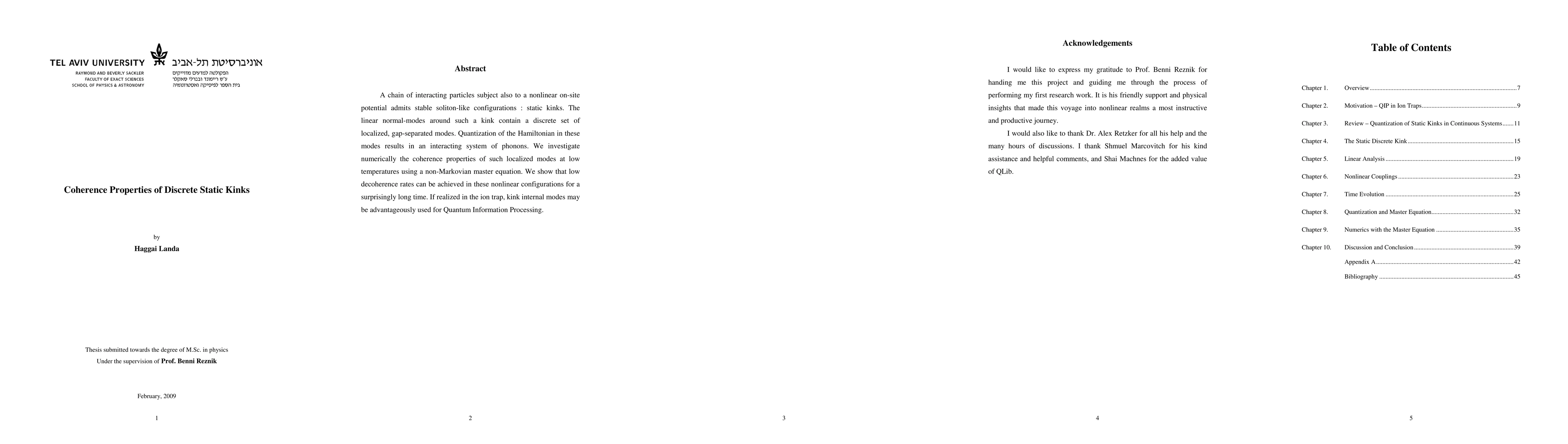 A chain of interacting particles subject also to a nonlinear on-site potential admits stable soliton-like configurations : static kinks. The linear normal-modes around such a kink contain a discrete set of localized, gap-separated modes. Quantization of the Hamiltonian in these modes results in an interacting system of phonons. We investigate numerically the coherence properties of such localized modes at low temperatures using a non-Markovian master equation. We show that low decoherence rates can be achieved in these nonlinear configurations for a surprisingly long time. If realized in the ion trap, kink internal modes may be advantageously used for Quantum Information Processing.