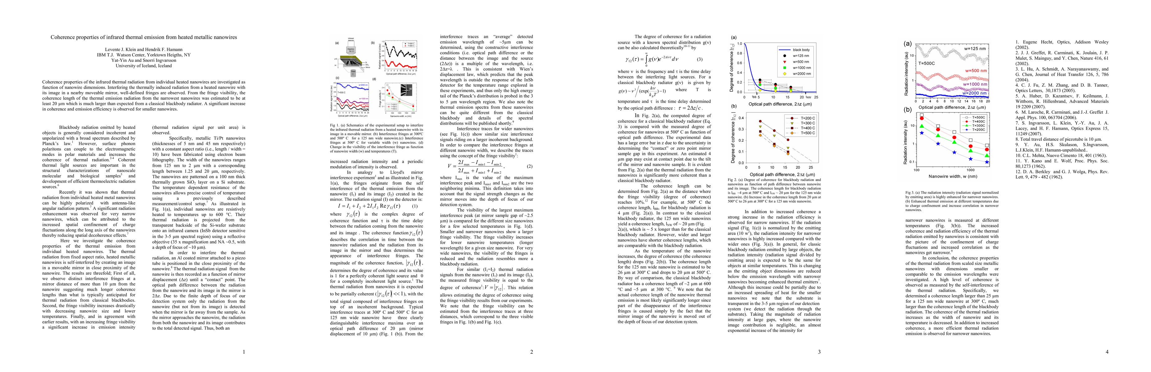 This study investigates the coherence properties of infrared thermal emission from heated metallic nanowires, revealing that the smallest nanowires exhibit coherence lengths of at least 20 µm, significantly larger than classical blackbody predictions, and show enhanced coherence and emission efficiency.