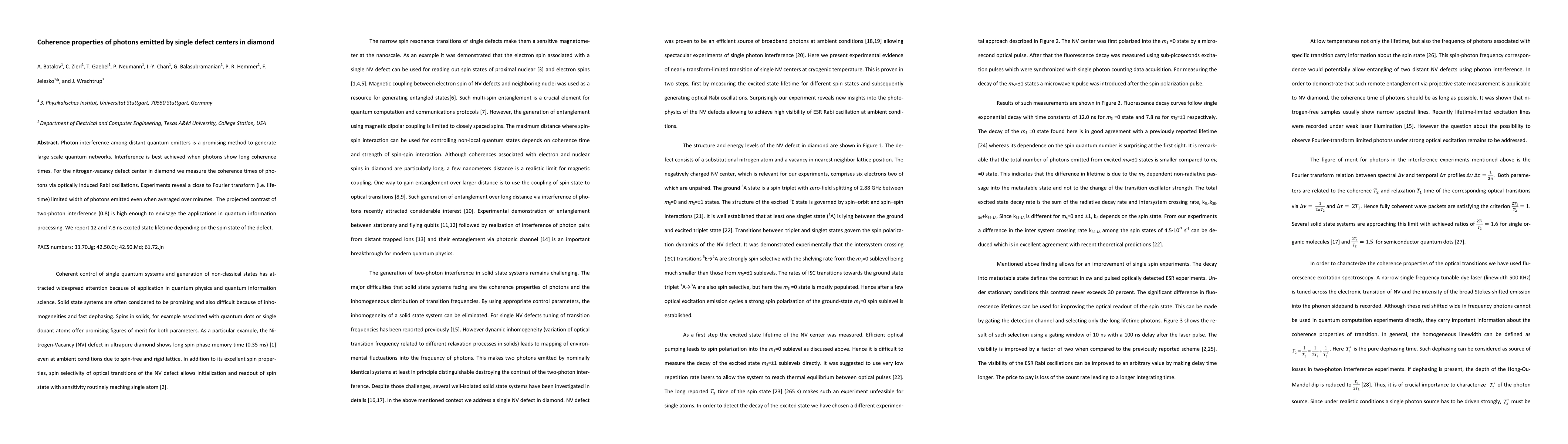 This paper investigates the coherence properties of photons emitted by nitrogen-vacancy defect centers in diamond, finding near Fourier transform limited coherence times. Experiments show high projected two-photon interference contrast (0.8), indicating potential for quantum information processing applications.