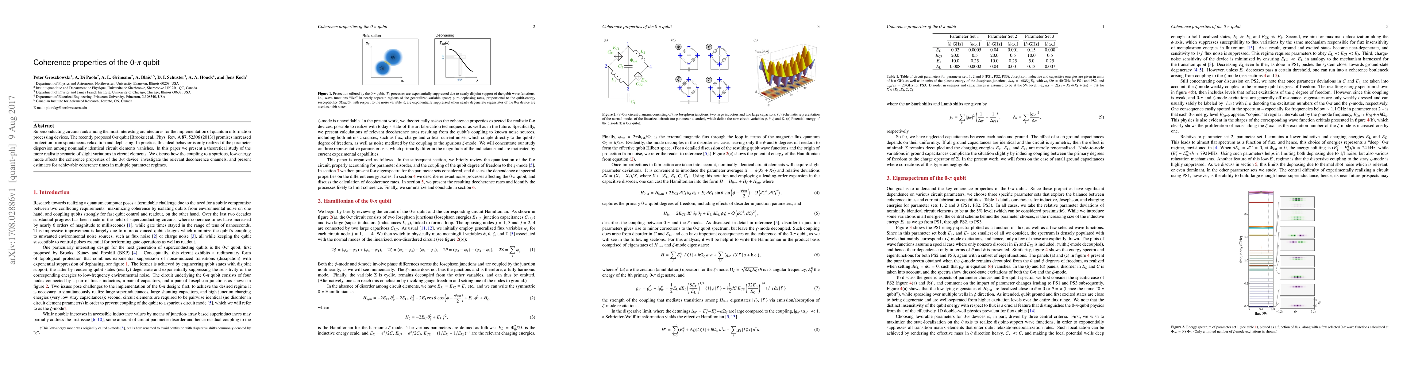 Superconducting circuits rank among the most interesting architectures for the implementation of quantum information processing devices. The recently proposed 0-$\pi$ qubit [Brooks et al., Phys. Rev. A ${\bf 87}$, 52306 (2013)] promises increased protection from spontaneous relaxation and dephasing. In practice, this ideal behavior is only realized if the parameter dispersion among nominally identical circuit elements vanishes. In this paper we present a theoretical study of the more realistic scenario of slight variations in circuit elements. We discuss how the coupling to a spurious, low-energy mode affects the coherence properties of the 0-$\pi$ device, investigate the relevant decoherence channels, and present estimates for achievable coherence times in multiple parameter regimes.