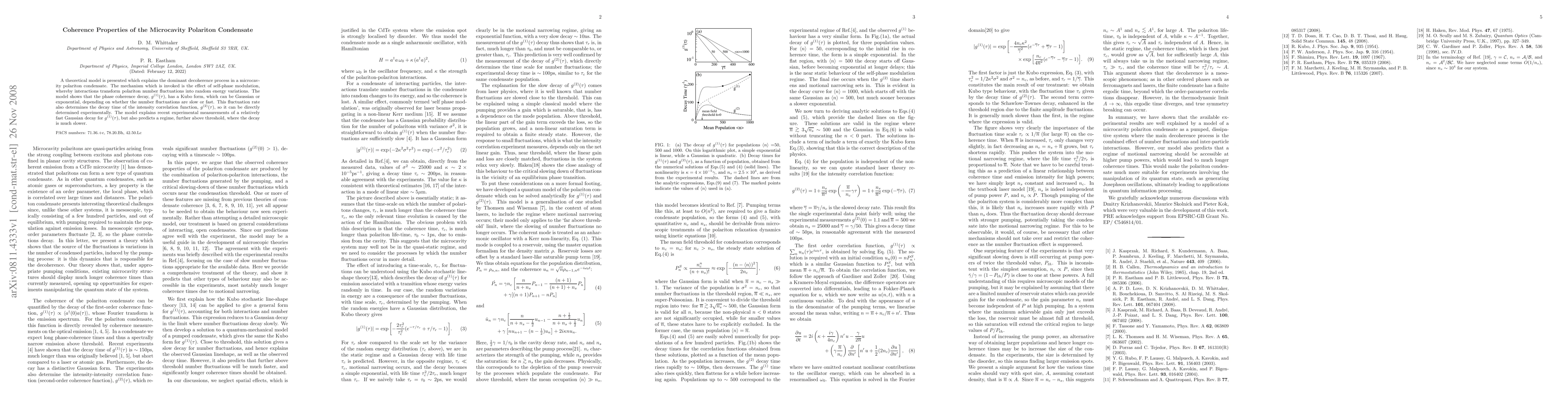 The paper presents a theoretical model explaining the dominant decoherence mechanism in microcavity polariton condensates via self-phase modulation, predicting Gaussian or exponential decay in phase coherence depending on polariton number fluctuations, and correlating the fluctuation rate to the decay time of intensity correlation function.