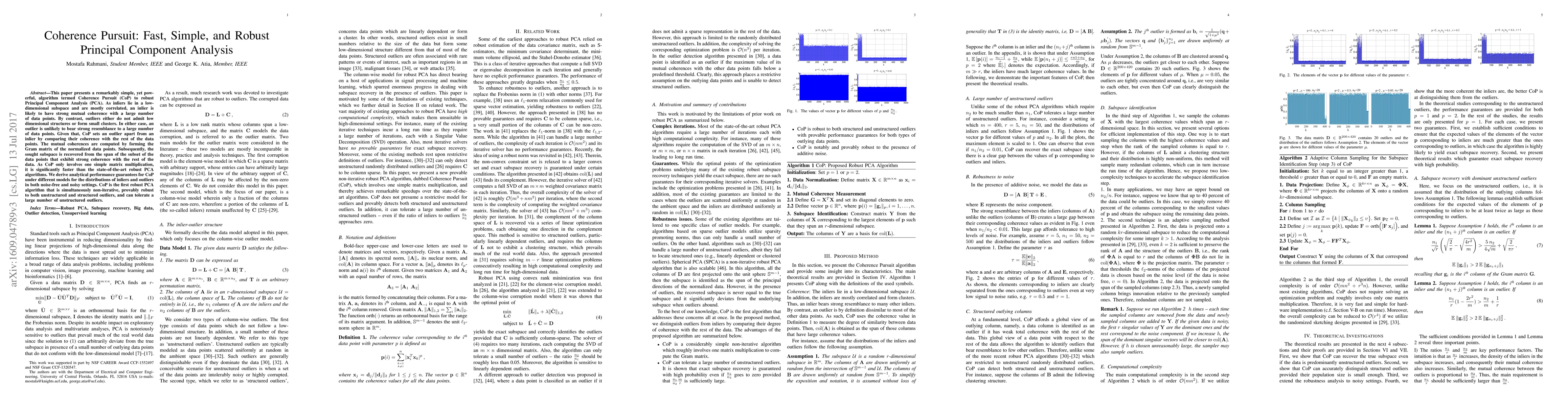 Coherence Pursuit (CoP) is a novel, efficient algorithm for robust PCA that identifies inliers based on mutual coherence with other data points, significantly outperforming existing methods. CoP is non-iterative, analytically proven robust, and can handle large numbers of unstructured outliers.