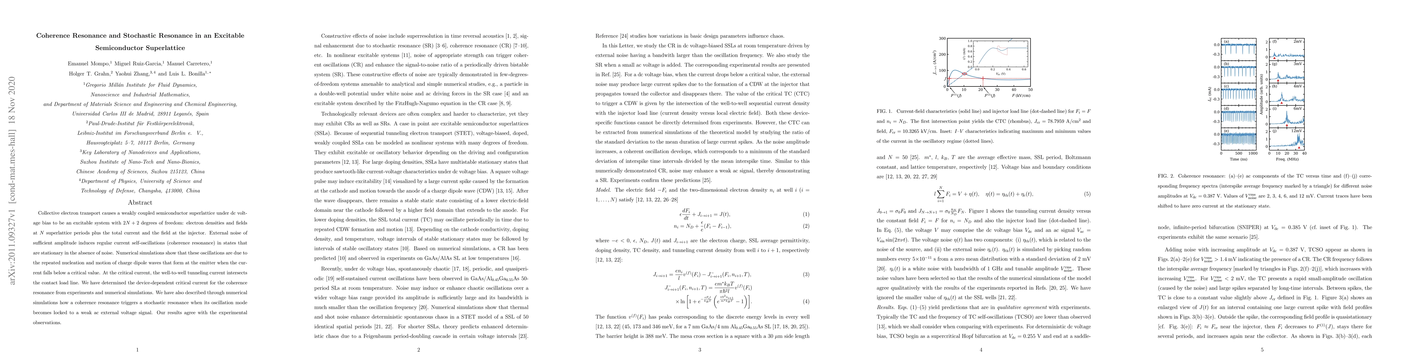 Collective electron transport causes a weakly coupled semiconductor superlattice under dc voltage bias to be an excitable system with $2N+2$ degrees of freedom: electron densities and fields at $N$ superlattice periods plus the total current and the field at the injector. External noise of sufficient amplitude induces regular current self-oscillations (coherence resonance) in states that are stationary in the absence of noise. Numerical simulations show that these oscillations are due to the repeated nucleation and motion of charge dipole waves that form at the emitter when the current falls below a critical value. At the critical current, the well-to-well tunneling current intersects the contact load line. We have determined the device-dependent critical current for the coherence resonance from experiments and numerical simulations. We have also described through numerical simulations how a coherence resonance triggers a stochastic resonance when its oscillation mode becomes locked to a weak ac external voltage signal. Our results agree with the experimental observations.