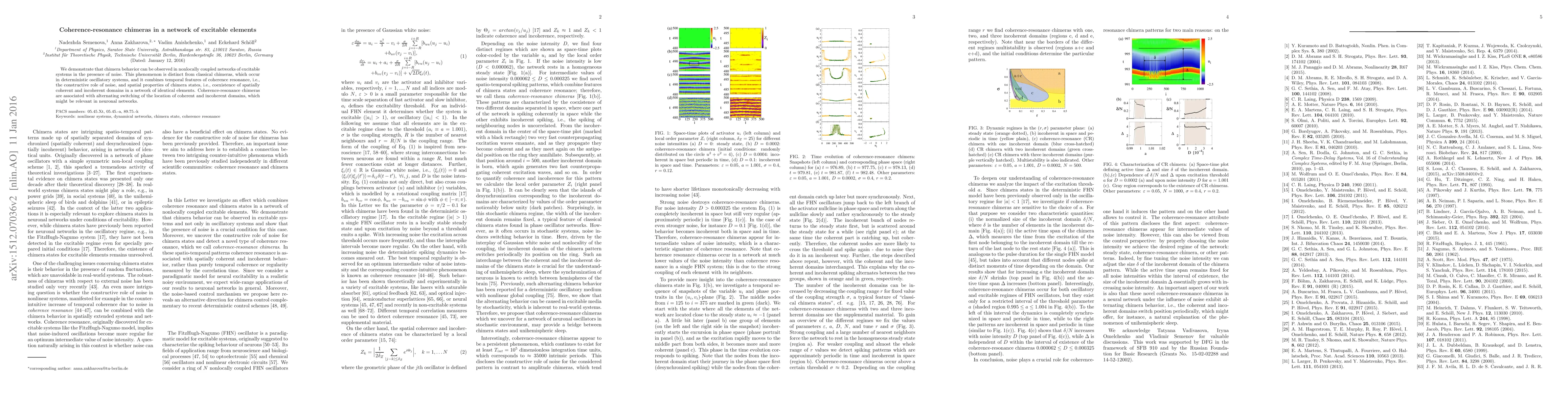 This paper explores coherence-resonance chimeras in networks of excitable elements, showing that noise can induce a unique chimera state combining coherence resonance and spatial chimera states. This phenomenon involves alternating coherent and incoherent domains, potentially relevant for understanding neuronal networks.
