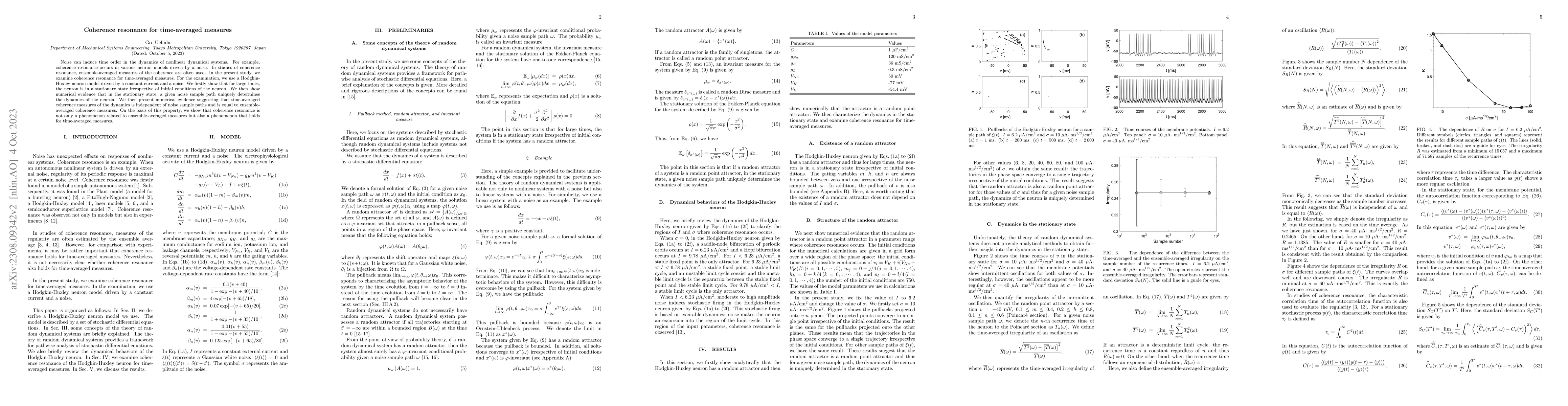 Noise can induce time order in the dynamics of nonlinear dynamical systems. For example, coherence resonance occurs in various neuron models driven by a noise. In studies of coherence resonance, ensemble-averaged measures of the coherence are often used. In the present study, we examine coherence resonance for time-averaged measures. For the examination, we use a Hodgkin-Huxley neuron model driven by a constant current and a noise. We firstly show that for large times, the neuron is in a stationary state irrespective of initial conditions of the neuron. We then show numerical evidence that in the stationary state, a given noise sample path uniquely determines the dynamics of the neuron. We then present numerical evidence suggesting that time-averaged coherence measures of the dynamics is independent of noise sample paths and is equal to ensemble-averaged coherence measures. On the basis of this property, we show that coherence resonance is not only a phenomenon related to ensemble-averaged measures but also a phenomenon that holds for time-averaged measures.