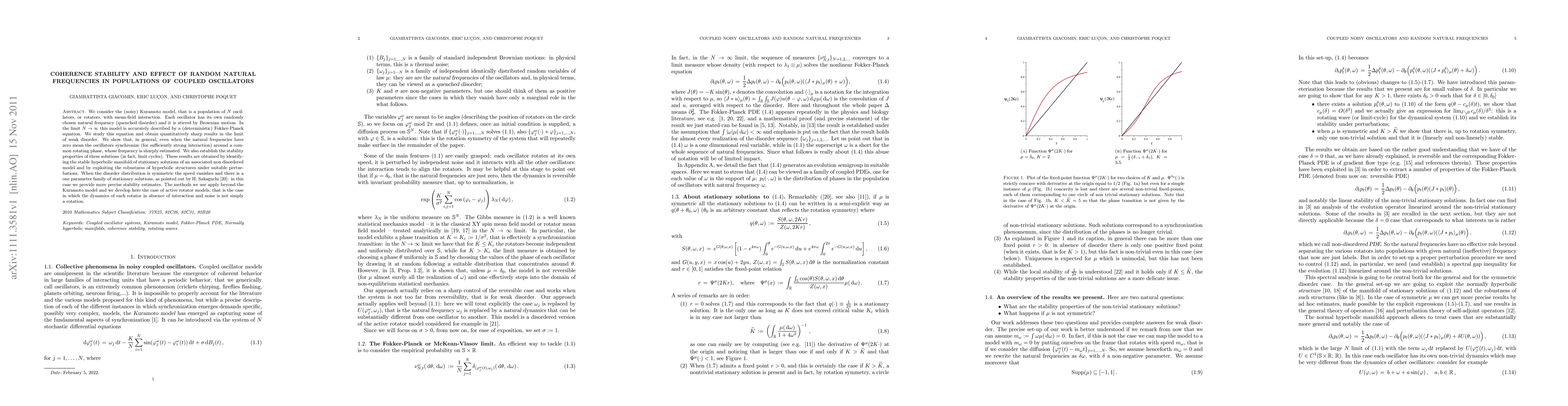 We consider the (noisy) Kuramoto model, that is a population of N oscillators, or rotators, with mean-field interaction. Each oscillator has its own randomly chosen natural frequency (quenched disorder) and it is stirred by Brownian motion. In the limit N goes to infty this model is accurately described by a (deterministic) Fokker-Planck equation. We study this equation and obtain quantitatively sharp results in the limit of weak disorder. We show that, in general, even when the natural frequencies have zero mean the oscillators synchronize (for sufficiently strong interaction) around a common rotating phase, whose frequency is sharply estimated. We also establish the stability properties of these solutions (in fact, limit cycles). These results are obtained by identifying the stable hyperbolic manifold of stationary solutions of an associated non disordered model and by exploiting the robustness of hyperbolic structures under suitable perturbations. When the disorder distribution is symmetric the speed vanishes and there is a one parameter family of stationary solutions : in this case we provide more precise stability estimates. The methods we use apply beyond the Kuramoto model and we develop here the case of active rotator models, that is the case in which the dynamics of each rotator in absence of interaction and noise is not simply a rotation.