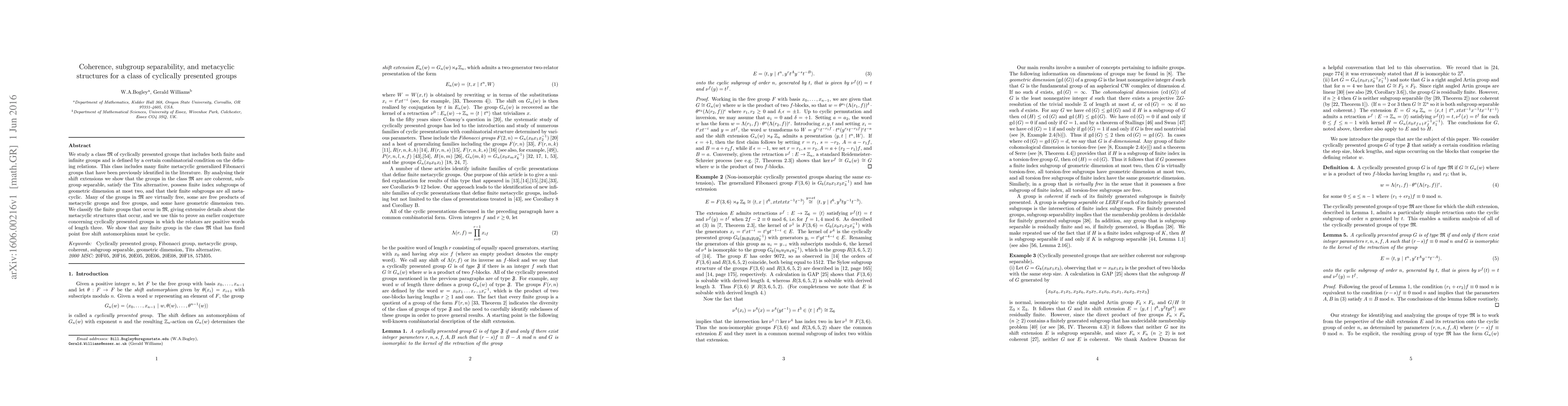 This paper investigates a class $\mathfrak{M}$ of cyclically presented groups, showing they are coherent, subgroup separable, and possess metacyclic finite subgroups. The authors classify the finite groups in $\mathfrak{M}$, proving that any finite, fixed point free shift automorphism in $\mathfrak{M}$ must be cyclic.