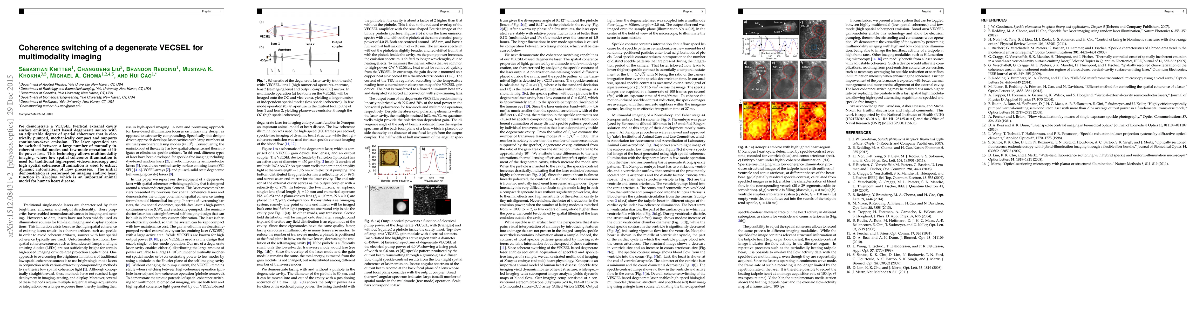 The research presents a novel VECSEL (vertical external cavity surface emitting laser) capable of switching between high and low spatial coherence states without significant power loss. This technology enables multimodality imaging, utilizing low coherence for high-speed video-microscopy and high coherence for dynamic flow process analysis. The paper demonstrates this on imaging embryo heart function in Xenopus, a significant model for human heart disease studies.