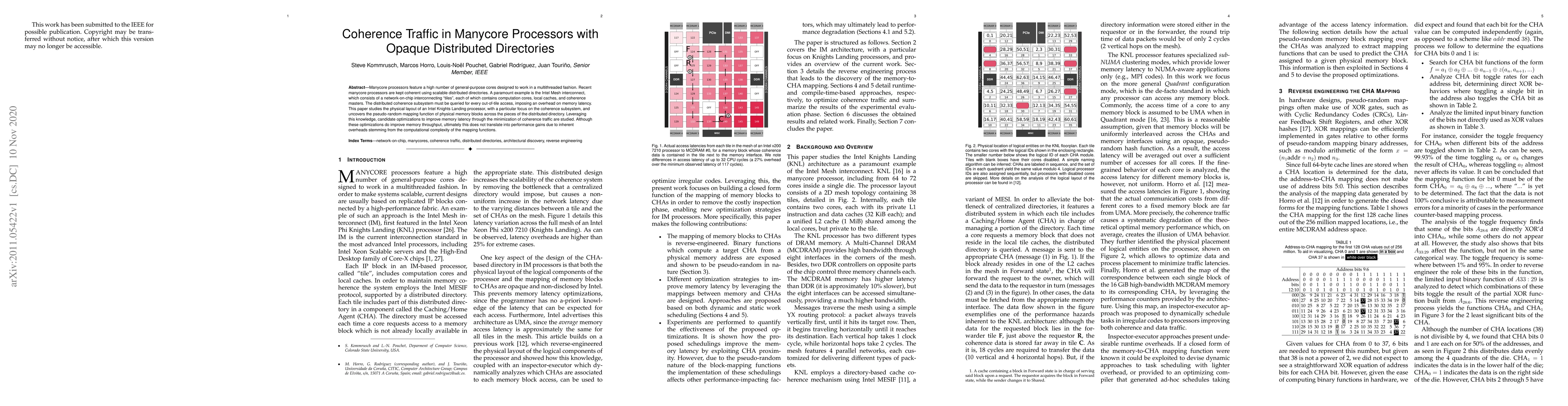 This paper examines the coherence traffic in manycore processors using distributed directories, focusing on the Intel Knights Landing processor. It identifies a pseudo-random memory mapping function and proposes optimizations to reduce coherence traffic, but finds that these do not yield performance gains due to the complexity of the mapping functions.