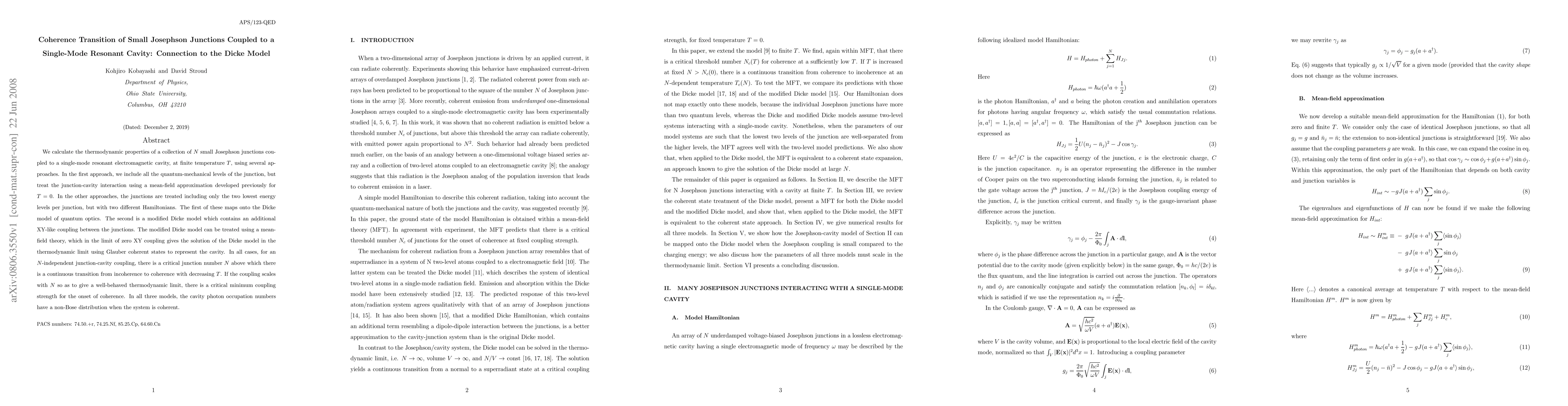 We calculate the thermodynamic properties of a collection of $N$ small Josephson junctions coupled to a single-mode resonant electromagnetic cavity, at finite temperature $T$, using several approaches. In the first approach, we include all the quantum-mechanical levels of the junction, but treat the junction-cavity interaction using a mean-field approximation developed previously for $T = 0$. In the other approaches, the junctions are treated including only the two lowest energy levels per junction, but with two different Hamiltonians. The first of these maps onto the Dicke model of quantum optics. The second is a modified Dicke model which contains an additional XY-like coupling between the junctions. The modified Dicke model can be treated using a mean-field theory, which in the limit of zero XY coupling gives the solution of the Dicke model in the thermodynamic limit using Glauber coherent states to represent the cavity. In all cases, for an $N$-independent junction-cavity coupling, there is a critical junction number $N$ above which there is a continuous transition from incoherence to coherence with decreasing $T$. If the coupling scales with $N$ so as to give a well-behaved thermodynamic limit, there is a critical minimum coupling strength for the onset of coherence. In all three models, the cavity photon occupation numbers have a non-Bose distribution when the system is coherent.