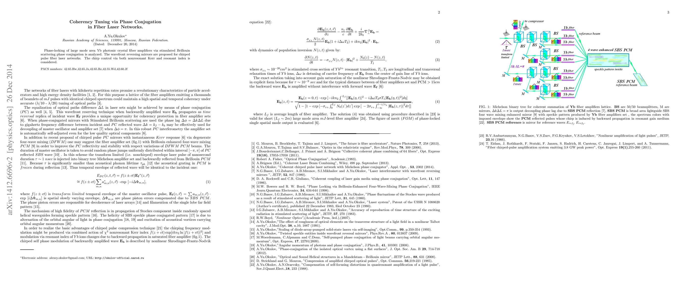 This paper investigates phase-locking in large mode area Yb photonic crystal fiber amplifiers using stimulated Brillouin scattering phase conjugation. It proposes wavefront reversing mirrors for chirped pulse fiber laser networks and examines chirp control through both nonresonant Kerr and resonant index effects.