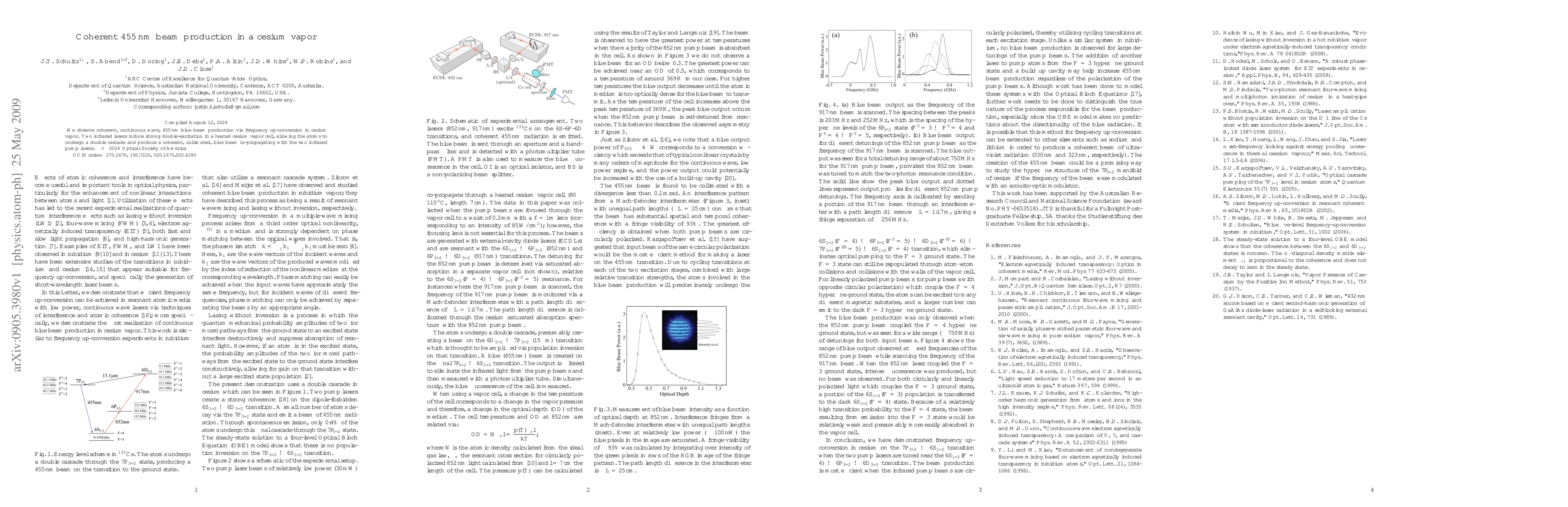 This paper reports the generation of a coherent, continuous wave 455nm blue beam through frequency up-conversion in cesium vapor using two infrared lasers to induce double-excitation, resulting in a double cascade process that produces a collimated blue beam.