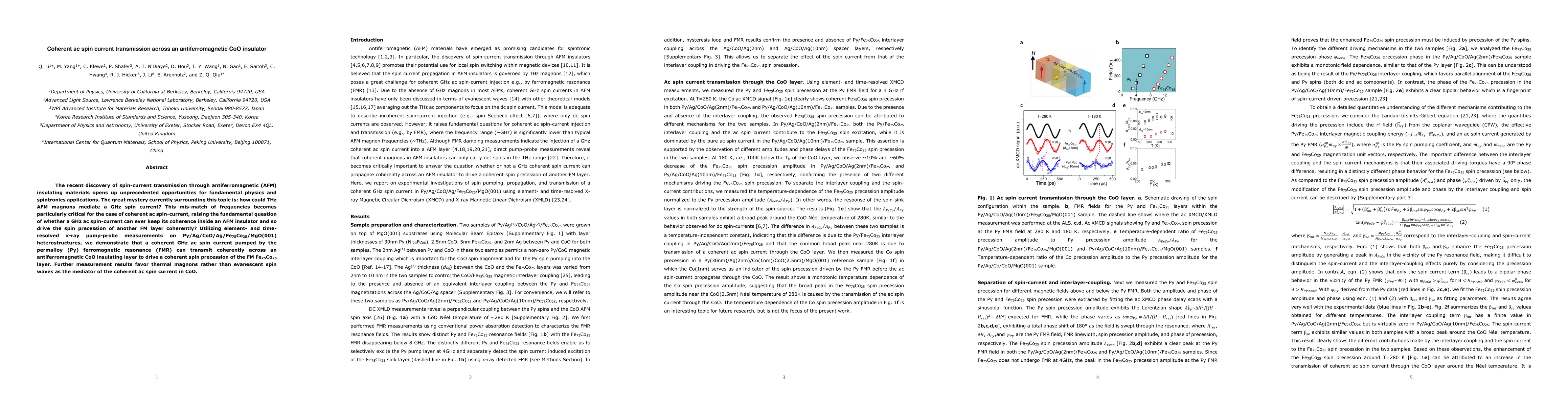This study demonstrates coherent GHz ac spin current transmission through an antiferromagnetic CoO insulator, resolving the frequency mismatch mystery by showing that thermal magnons mediate the coherent spin precession in a ferromagnetic Fe75Co25 layer. Element- and time-resolved x-ray measurements confirm the coherence preservation of the spin current across the insulating layer.